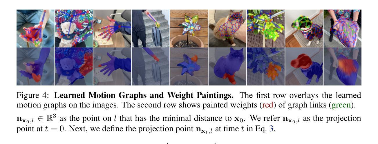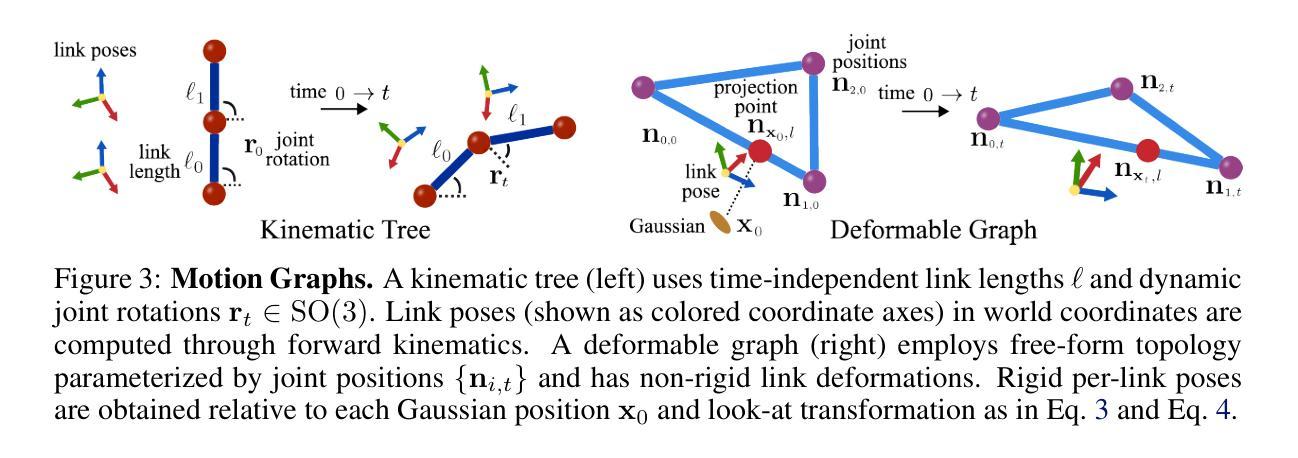 - 通过双重四元数蒙皮将运动图的链接运动传播到各个高斯分布。