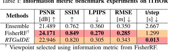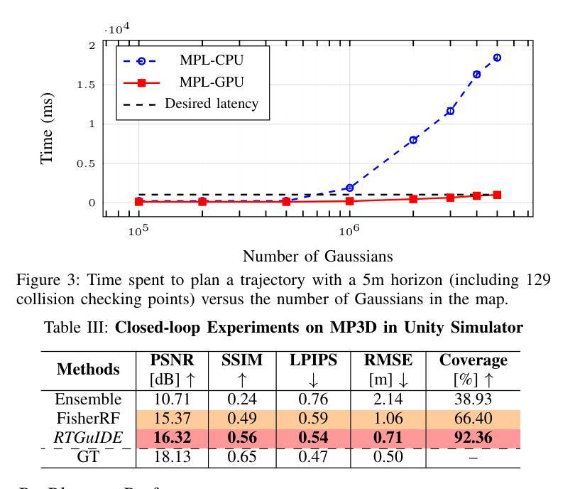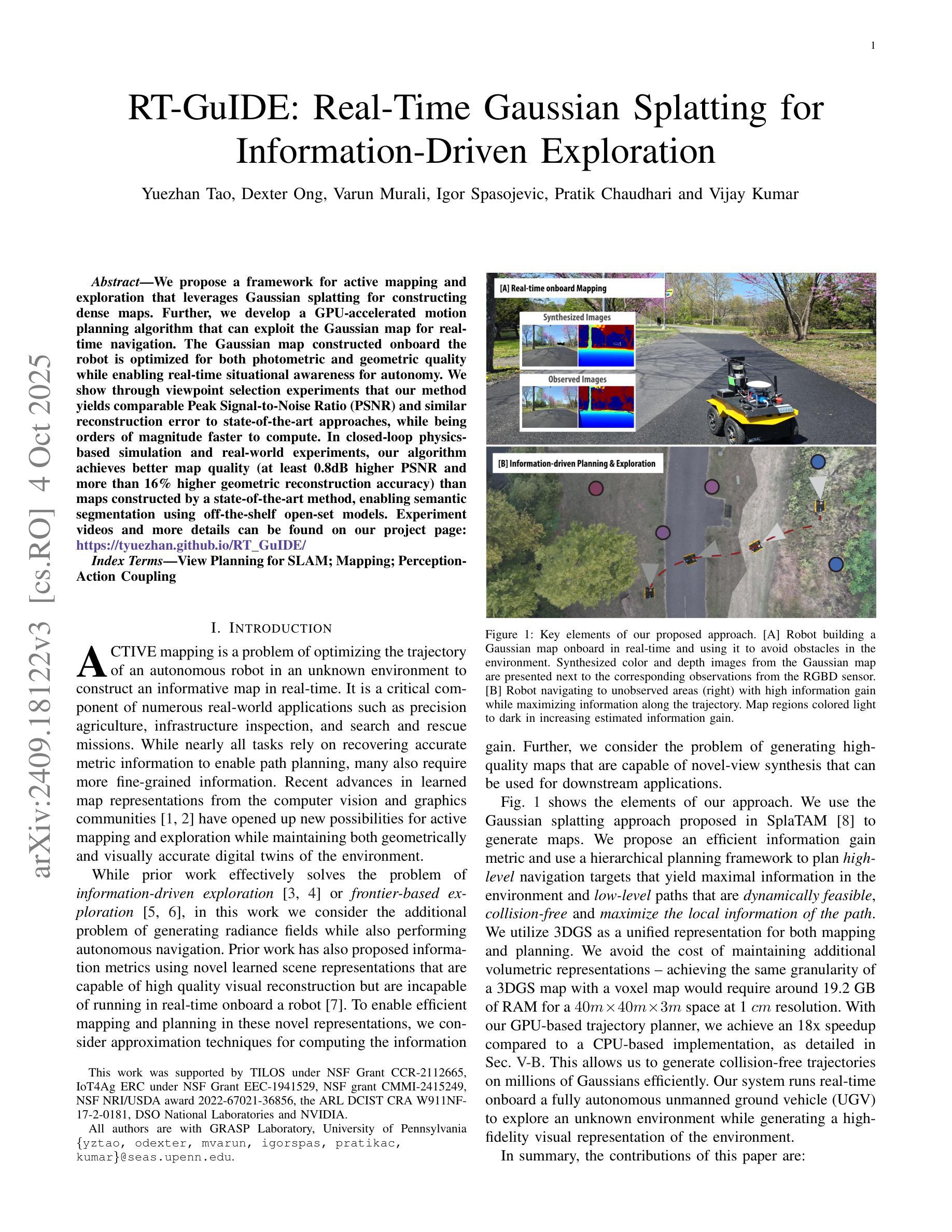 我们提出一个利用高斯喷溅技术进行密集地图构建的主动映射和探索框架。此外,我们开发了一个GPU加速的运动规划算法,该算法可以利用高斯地图进行实时导航。在机器人内部构建的高斯地图针对光度和几何质量进行了优化,同时提高了自主性的实时情境意识。我们通过视点选择实验表明,我们的方法在峰值信噪比(PSNR)上产生了与最新技术相当的结果,重建误差相似,但计算速度却快得多。在闭环物理仿真和真实世界实验中,我们的算法在地图质量方面表现更好(至少高出0.8dB的PSNR和超过16%的几何重建精度),超越了当前最先进的地图构建方法,并使用现成的开放集模型实现了语义分割。实验视频和更多细节可以在我们的项目页面找到:https://tyuezhan.github.io/RT指引/。