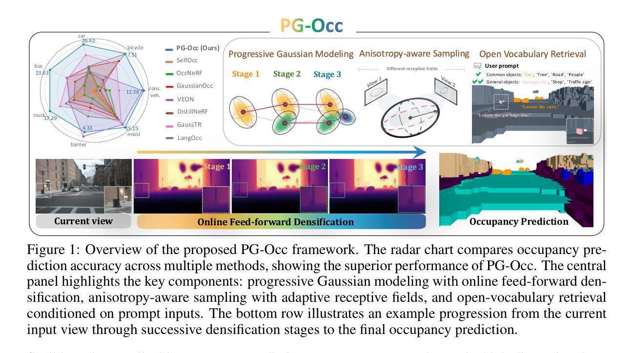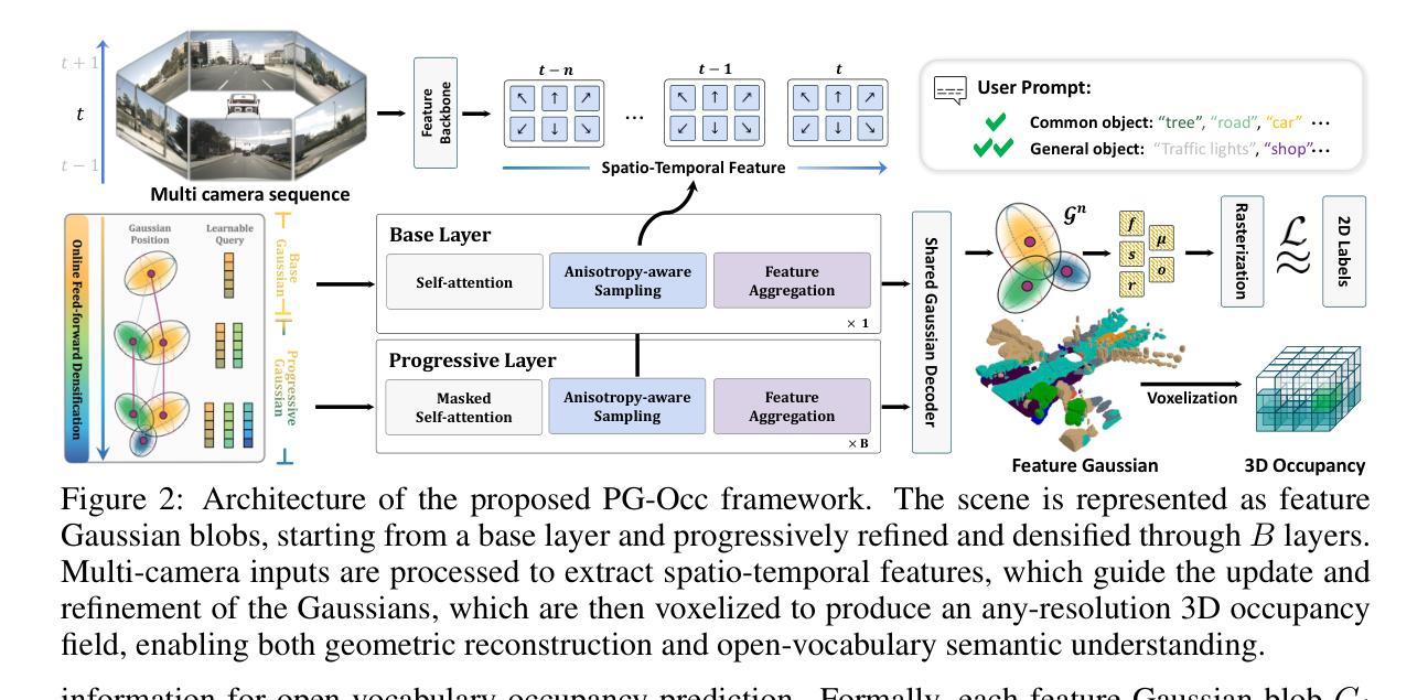 近年来,三维占用预测任务取得了显著进展,在基于视觉的自动驾驶系统中发挥了至关重要的作用。虽然传统方法局限于固定的语义类别,但最近的方法已经转向预测文本对齐的特征,以便在真实世界场景中实现开放式词汇文本查询。然而,文本对齐场景建模存在权衡:稀疏的高斯表示很难捕捉场景中的小物体,而密集表示则会产生巨大的计算开销。为了解决这些局限性,我们提出了PG-Occ,一种创新的渐进式高斯变换框架,可实现开放式词汇三维占用预测。我们的框架采用渐进式在线致密化策略,这是一种前馈策略,逐步增强三维高斯表示以捕捉场景的精细细节。通过迭代增强表示,该框架实现了越来越精确和详细的场景理解。另一个关键贡献是引入了具有时空融合的各向异性感知采样策略,该策略自适应地为不同尺度和阶段的高斯分配感受野,从而实现更有效的特征聚合和更丰富的场景信息捕获。通过广泛评估,我们证明PG-Occ达到了最先进的性能,相对于之前性能最佳的方法,相对提高了14.3%的mIoU。代码和预训练模型将在我们的项目页面发布时公布:https://yanchi-3dv.github.io/PG-Occ。