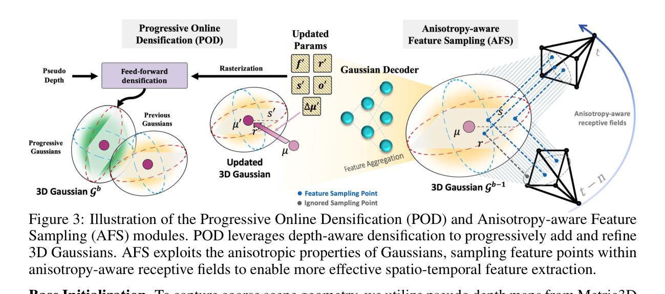- 框架引入了一种具有时空融合功能的各向异性感知采样策略,能自适应地为不同尺度和阶段的高斯分配感受野。