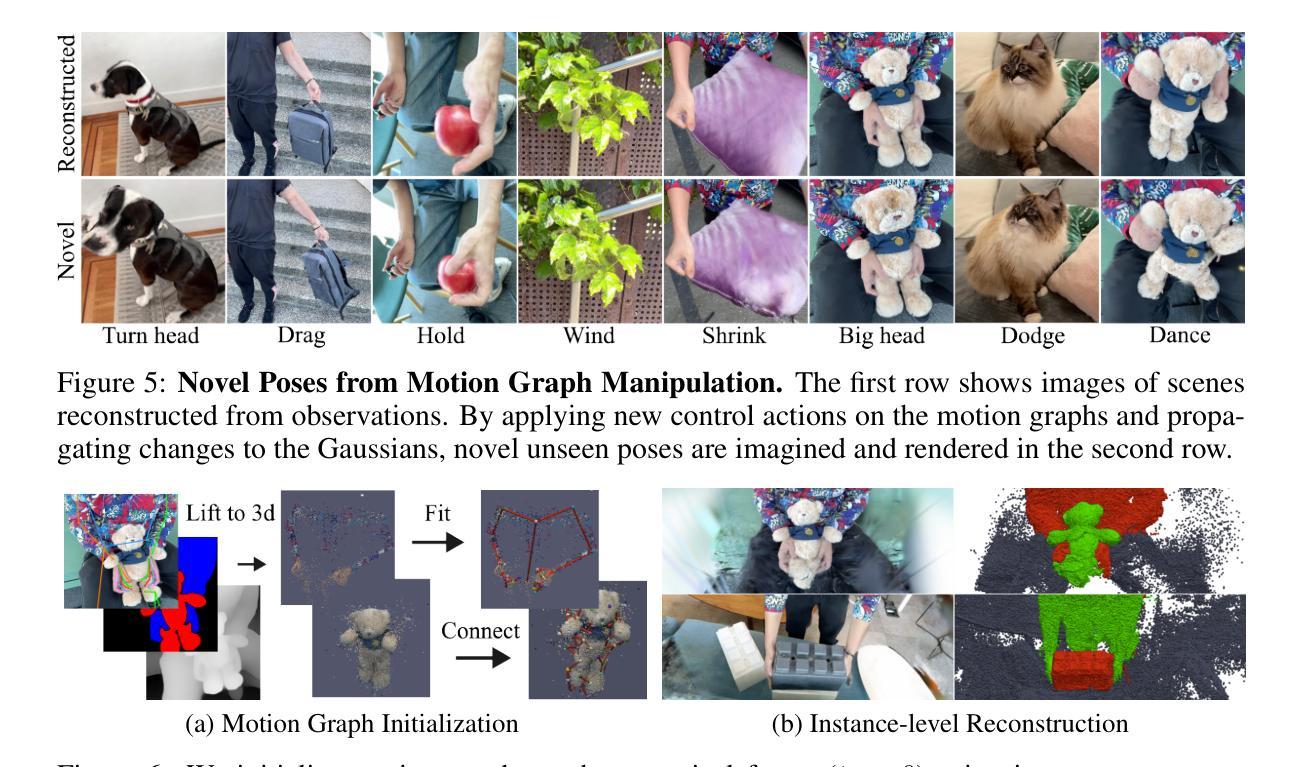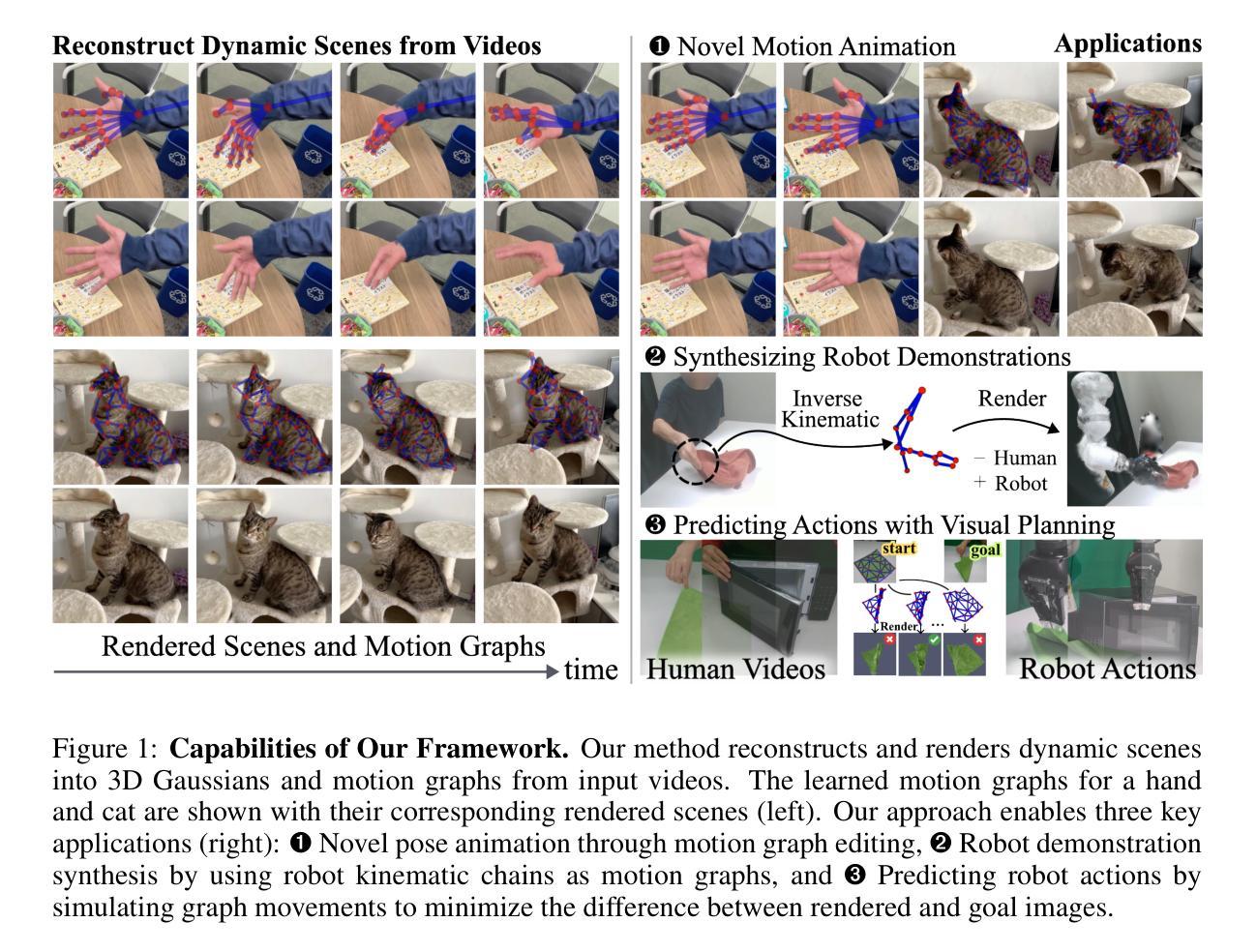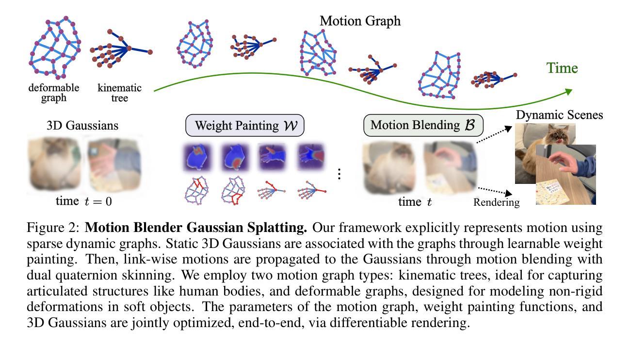 高斯涂斑技术已成为重建动态场景的高保真工具。然而,现有方法主要依赖隐式运动表示,如将运动编码到神经网络或每个高斯参数中,这使得进一步操纵重建运动变得困难。这种缺乏明确可控性的限制使现有方法仅限于回放记录的运动,阻碍了其在机器人领域的更广泛应用。为解决此问题,我们提出使用运动图作为显式且稀疏的运动表示的全新框架——Motion Blender Gaussian Splatting(MBGS)。图链接的运动通过双重四元数蒙皮传播到各个高斯分布,可通过学习权重绘制函数来确定每个链接的影响。运动图和3D高斯分布通过可微分渲染从输入视频联合优化。实验表明,MBGS在极具挑战性的iPhone数据集上达到了最先进的性能,同时在HyperNeRF上具有很强的竞争力。我们展示了该方法在动画新物体姿态、合成真实机器人演示以及通过视觉规划预测机器人动作方面的应用潜力。