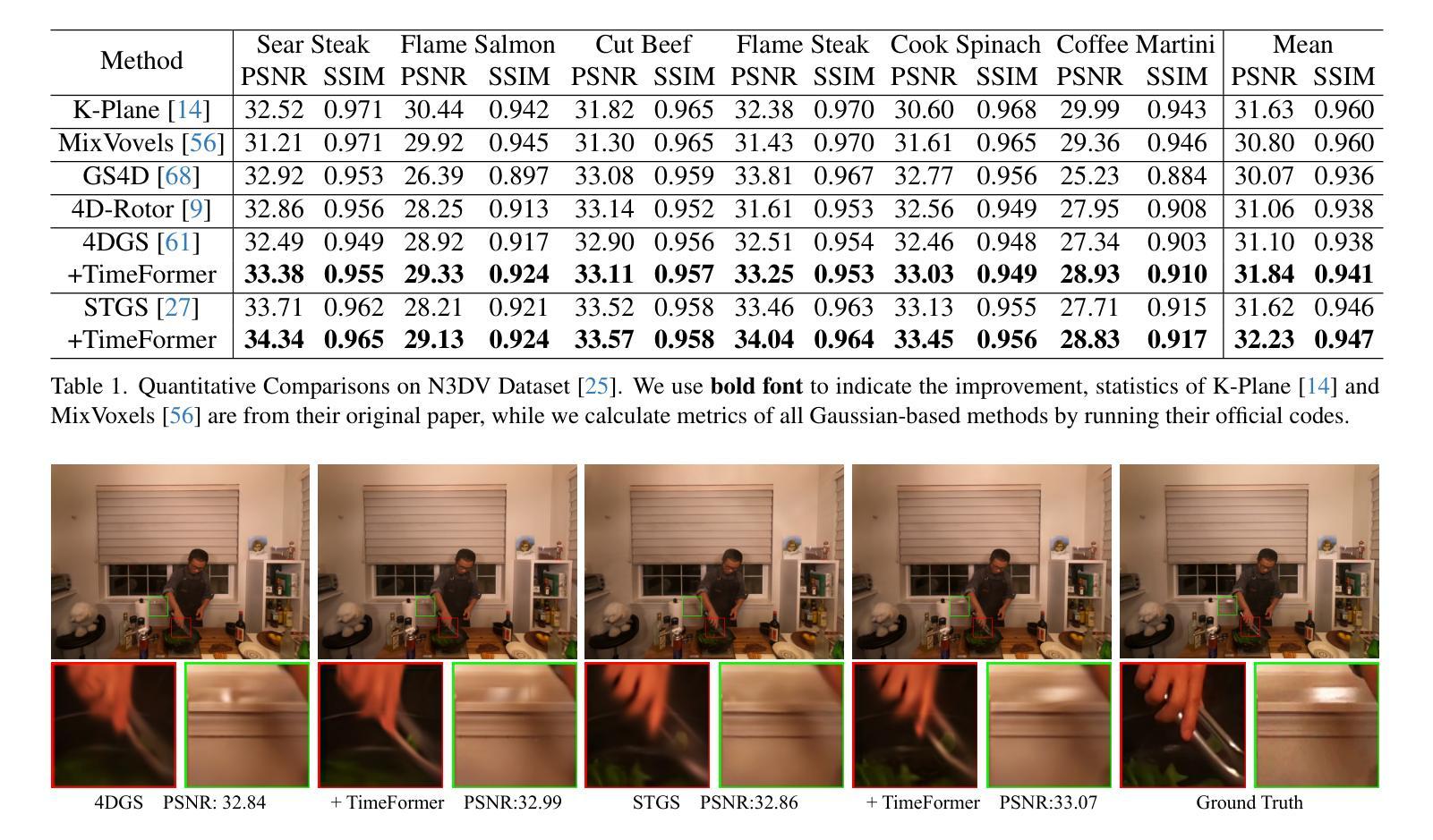 - 在推理阶段,可以移除TimeFormer以保持原始渲染速度,经过多视角和单目动态场景的广泛实验验证,TimeFormer能够提高定性和定量的表现。