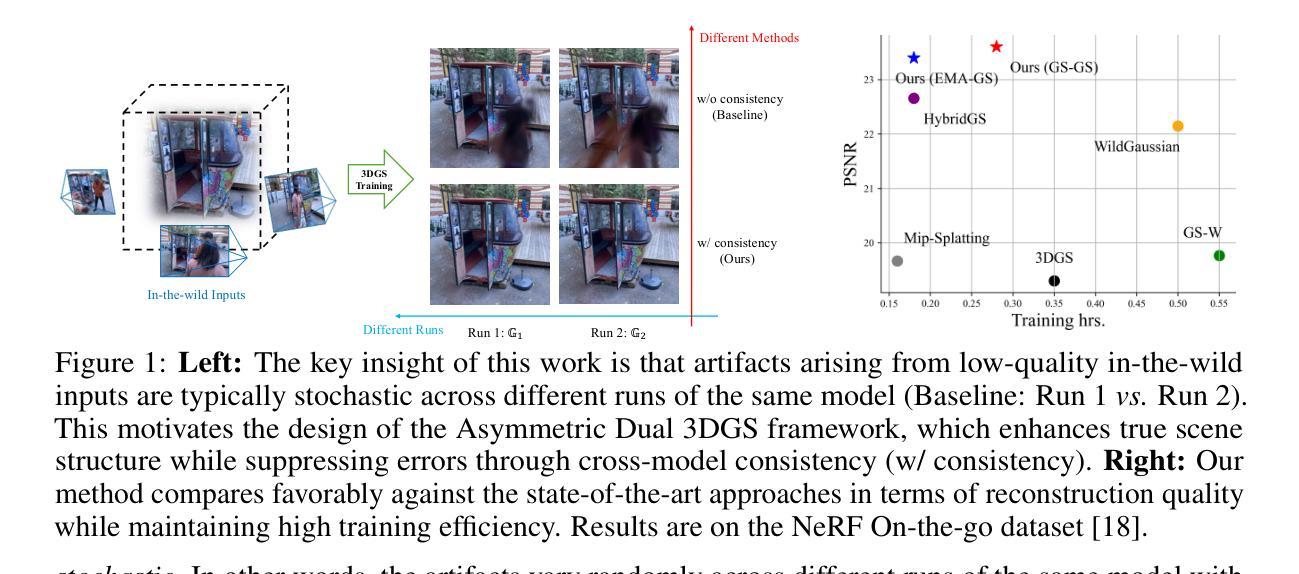 从野生图像中进行3D重建仍然是一项具有挑战性的任务,因为存在光照条件不一致和短暂干扰物等问题。现有方法通常依赖于启发式策略来处理低质量训练数据,这往往难以产生稳定和一致的重建结果,经常导致视觉伪影。在这项工作中,我们提出了名为“模型名称”的新框架,该框架利用这些伪影的随机性:它们倾向于在不同的训练运行中有所不同,这是由于存在轻微随机性。具体来说,我们的方法并行训练两个3D高斯展布(3DGS)模型,实施一致性约束,以鼓励可靠的场景几何收敛,同时抑制不一致的伪影。为了防止两个模型因确认偏见而陷入相似的失败模式,我们引入了一种发散掩蔽策略,该策略应用两种互补掩蔽:多线索自适应掩蔽和自我监督软掩蔽,这导致两个模型的不对称训练过程,减少共享错误模式。此外,为了提高模型训练的效率,我们引入了一个轻量级变体,称为动态EMA代理,它用动态更新的指数移动平均(EMA)代理替换其中一个模型,并采用交替掩蔽策略来保持发散。在具有挑战性的真实世界数据集上的大量实验表明,我们的方法始终优于现有方法,同时实现了高效率。请参阅项目网站:https://steveli88.github.io/AsymGS。