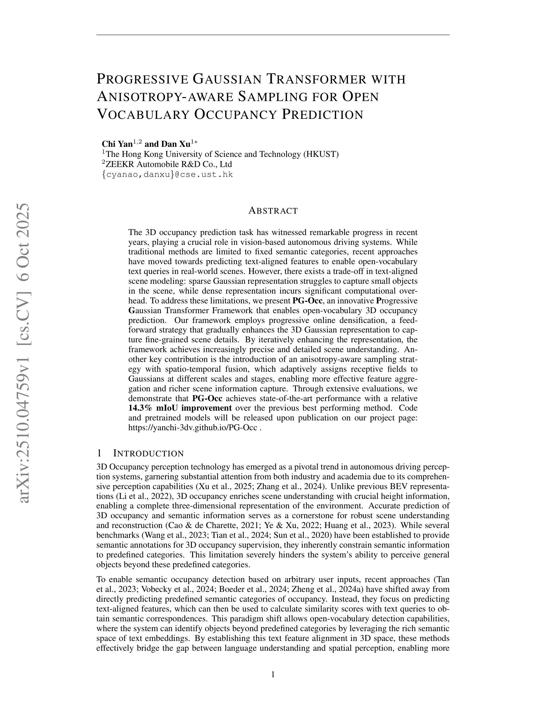 近年来,三维占用预测任务在基于视觉的自动驾驶系统中取得了显著进展。传统方法受限于固定语义类别,而新方法趋向于预测文本对齐特征,以实现现实世界场景中的开放词汇文本查询。但文本对齐场景建模存在权衡:稀疏高斯表示难以捕捉场景中的小物体,而密集表示则带来显著的计算开销。为解决这些限制,我们提出了PG-Occ,一种创新的渐进式高斯变换框架,可实现开放词汇表的三维占用预测。