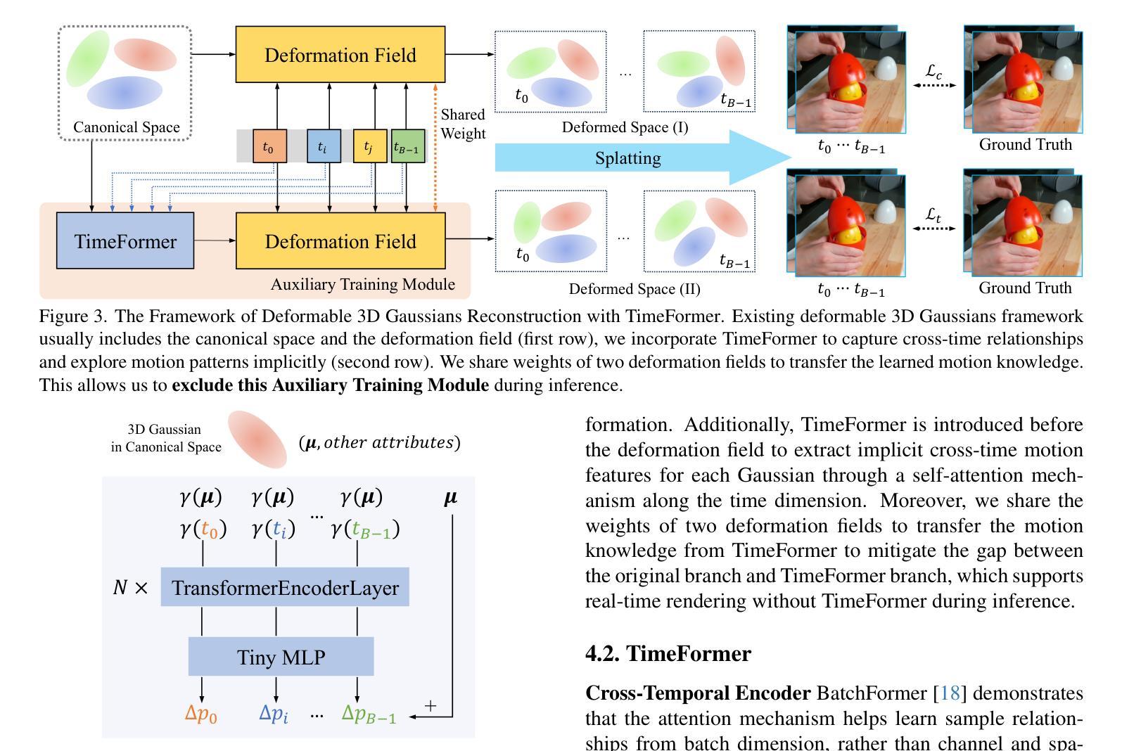 - TimeFormer包括一个跨时间Transformer编码器,可以自适应地学习可变形3D高斯值的临时关系。