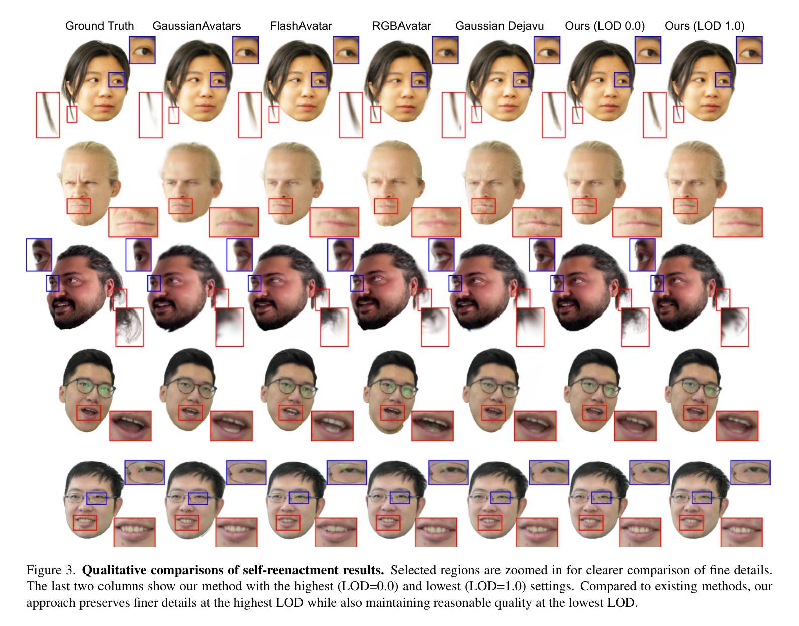 基于三维高斯理论(3DGS)的研究,已成功实现了三维头像的光照现实即时渲染技术。现有的基于3DGS的头像通常需要数万三维高斯点来完成渲染效果,且一旦训练完成,高斯点的数量就无法更改。然而在实际应用中,为了满足渲染效率和视觉质量的平衡,往往需要对细节层次(LOD)进行灵活调整。在此研究中,我们提出了“ArchitectHead”这一全新的框架,用以创建支持连续LOD控制的三维高斯头像。我们的核心理念在于在二维UV特征空间内对高斯参数进行设定,并提出由多层可学习特征图构成的UV特征场以编码其潜在特征。然后,一个轻量级的神经网络解码器将这些潜在特征转化为用于渲染的三维高斯属性。ArchitectHead通过动态从UV特征场重新采样特征图并调整至所需分辨率来控制高斯点的数量。这种方法能够在无需重新训练的情况下,实现对LOD的高效连续控制。实验结果表明,在最高LOD下,ArchitectHead在自我和跨身份重建任务中达到了领先水平(SOTA),同时在较低LOD下也保持了接近SOTA的性能表现。在最低LOD状态下,我们的方法仅使用6.2%的高斯点便能维持适中的质量下降(L1损失增加7.9%,PSNR下降0.97%,SSIM下降0.6%,LPIPS损失增加24.1%),同时渲染速度几乎翻倍。