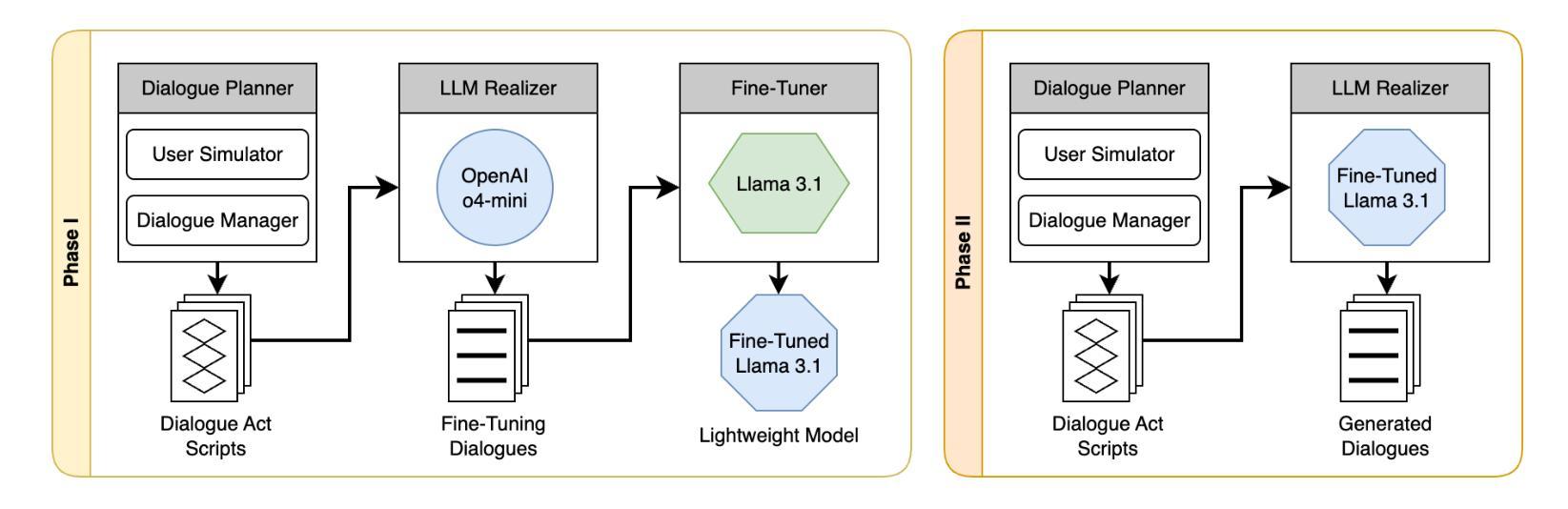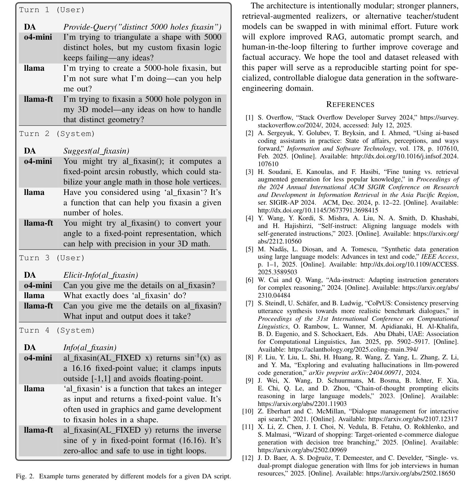 大语言模型助手适合解释流行的API,但在专业或专有库中却举步维艰,因为微调所需的多轮对话数据非常稀缺。我们推出了APIDA-Chat,这是一个开源管道,它将符号式对话行为“脚本”转化为现实、基于领域的API搜索对话,使用轻量级模型进行低成本训练数据生成。第一阶段将传统的对话规划器与高性能教师大型语言模型(o4-mini)配对,合成一组已实现的对话“金集”;然后,在语料库上对较小规模的Llama 3.2 3B学生模型进行微调。第二阶段放弃教师模型,重复使用同一规划器与已微调过的模型,在不向外部服务暴露源代码的情况下,快速低成本地合成新的对话。经过微调的学生的BLEU得分从0.38提高到0.50,BERTScore从0.88提高到0.91,相较于基础模型有所提升,同时全部运行在单个消费级GPU上。所有组件模块化且已公开发布,作为未来工作的保守基线。APIDA-Chat已开源,可在https://github.com/Zeberhart/apida-chat获取,视频演示可在https://youtu.be/YqmZBHyGbPs观看。