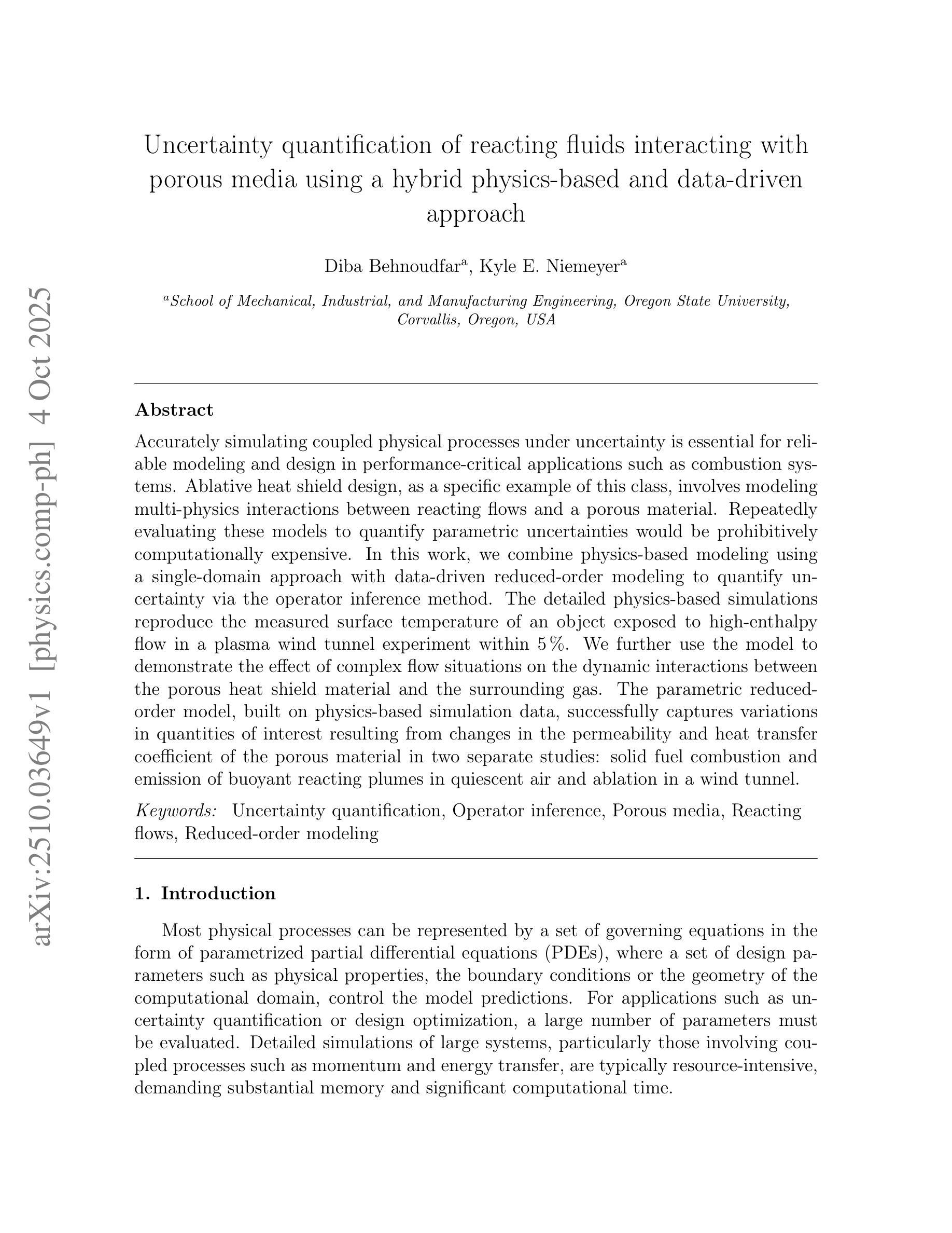 在燃烧系统等性能关键应用中,准确模拟不确定性下的耦合物理过程对于可靠建模和设计至关重要。作为此类设计的一个具体例子,烧蚀热防护设计涉及模拟反应流动与多孔材料之间的多物理相互作用。反复评估这些模型以量化参数不确定性在计算上将是极其昂贵的。在这项工作中,我们结合基于物理的建模方法(采用单域方法)和基于数据驱动的降阶建模来通过操作推断法量化不确定性。基于物理的详细模拟在等离子体风洞实验中重现了暴露于高熵流动下的物体表面温度,误差在5%以内。我们进一步使用该模型来演示复杂流动情况对多孔热防护材料与周围气体之间动态相互作用的影响。参数化的降阶模型基于物理仿真数据,成功捕获了两次独立研究中关注的数量变化,这些变化是由多孔材料的渗透性和传热系数的变化引起的:固体燃料燃烧和静止空气中上升反应羽流的排放以及风洞中的烧蚀。