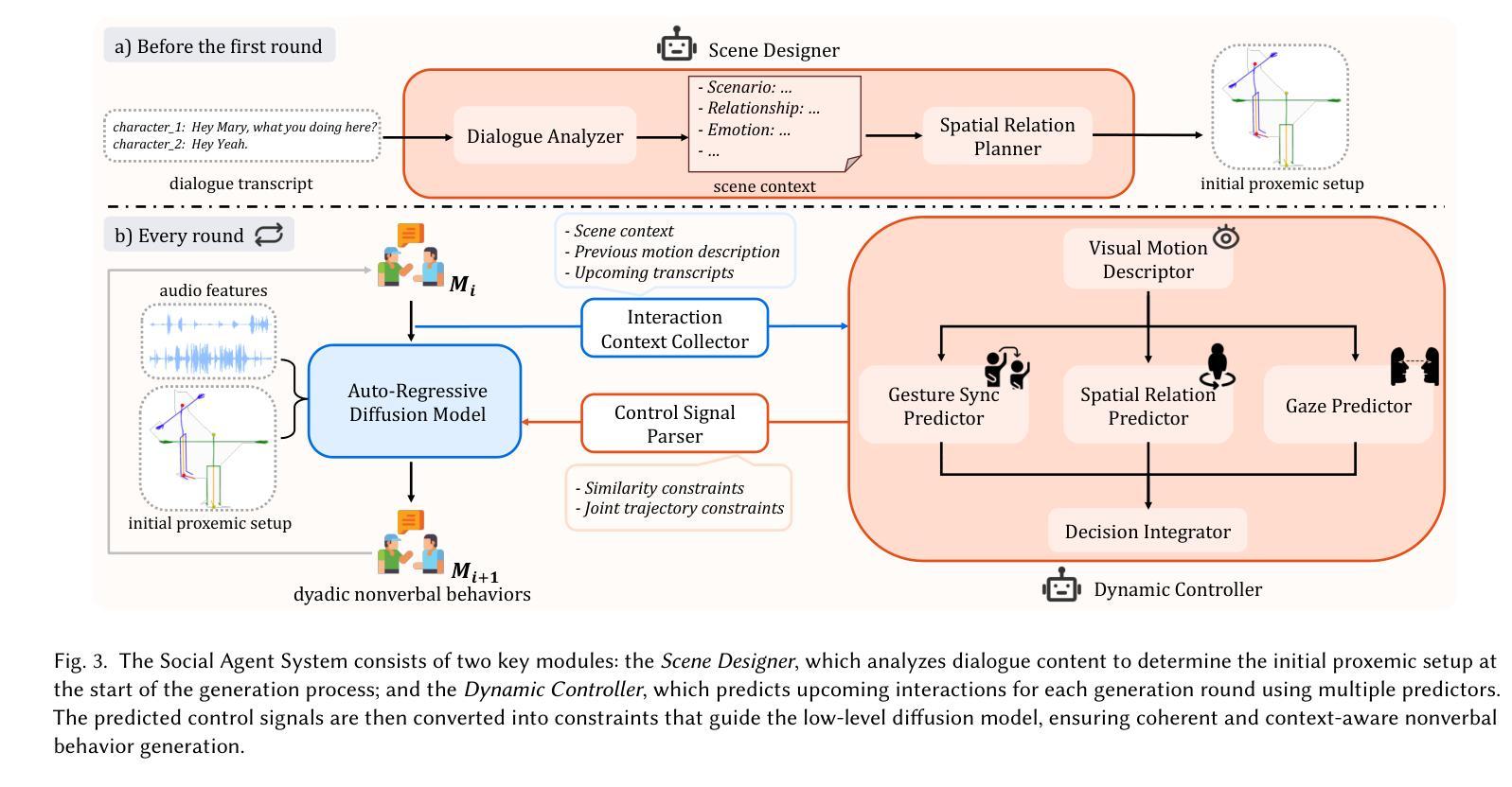 我们提出了Social Agent,这是一个新的框架,用于合成二元对话中现实且上下文恰当的伴随语音的非言语行为。在这个框架中,我们开发了一个由大型语言模型(LLM)驱动的主体系统,以引导对话流程并为双方确定适当的交互行为。此外,我们提出了一种基于自回归扩散模型的新型双人姿态生成模型,该模型能从语音信号中合成协调动作。主体系统的输出被转化为手势生成器的高级指导,从而在行为和运动层面产生逼真的动作。此外,主体系统会定期检查对话者的动作并推断其意图,形成一个连续的反馈循环,使两个参与者之间能够进行动态和响应式的交互。用户研究和定量评估表明,我们的模型显著提高了二元交互的质量,产生了自然、同步的非言语行为。