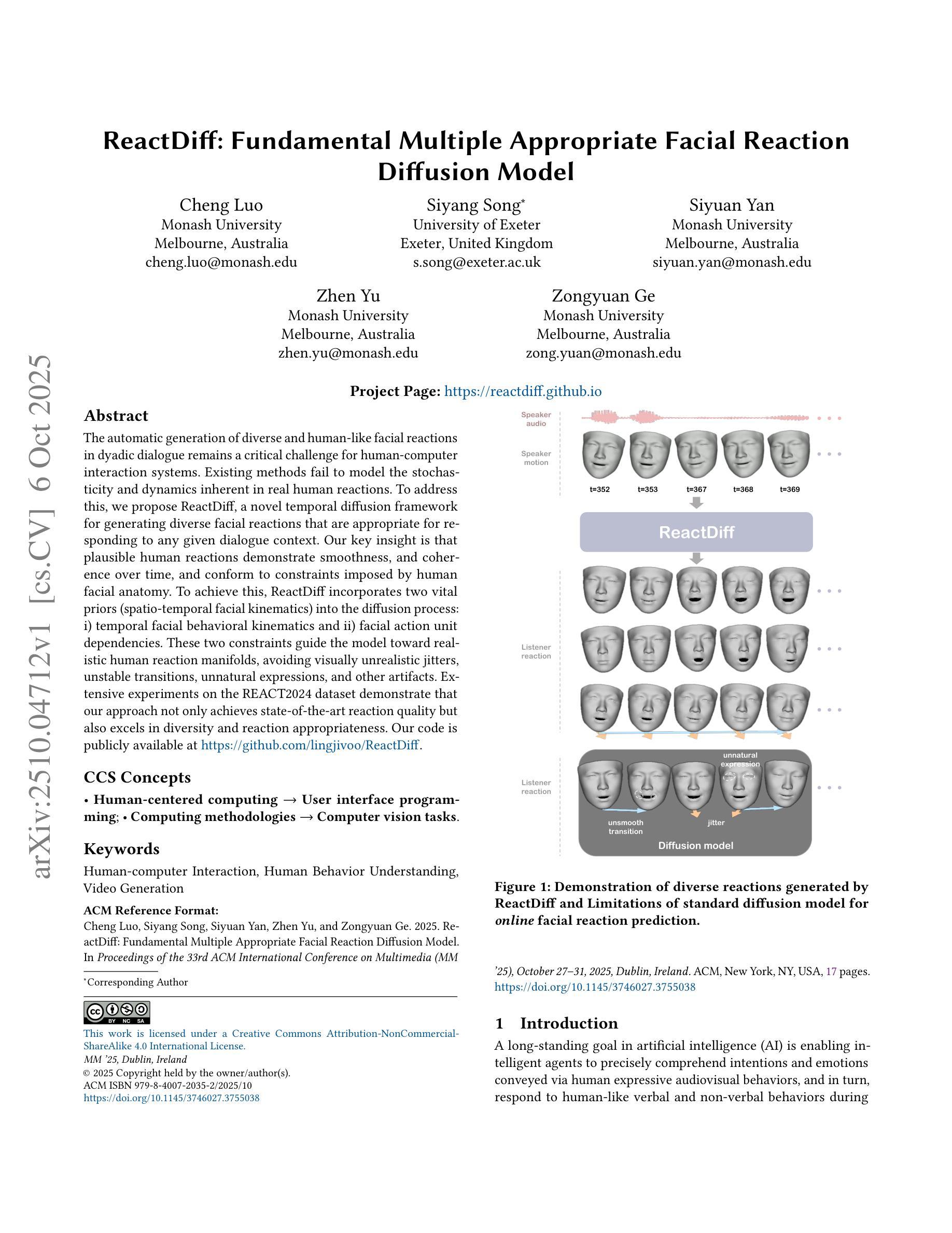 自动化生成二元对话中多样且人性化的面部反应仍是人机交互系统的一大挑战。现有方法无法模拟真实人类反应中的随机性和动力学特性。为解决此问题,我们提出ReactDiff,一种新型的时间扩散框架,用于生成与给定对话上下文相适应的多样面部反应。我们的关键见解是,合理的人类反应表现出时间上的平滑和连贯性,并符合人类面部解剖学的约束。为实现这一点,ReactDiff将两个关键先验(时空面部运动学和面部动作单元依赖)融入扩散过程中。这两方面的约束使模型面向现实的人类反应流形,避免视觉上的抖动、不稳定的过渡、不自然的表情和其他伪像。在REACT2024数据集上的大量实验证明,我们的方法不仅实现了最先进的反应质量,而且在多样性和反应适宜性方面也表现出色。