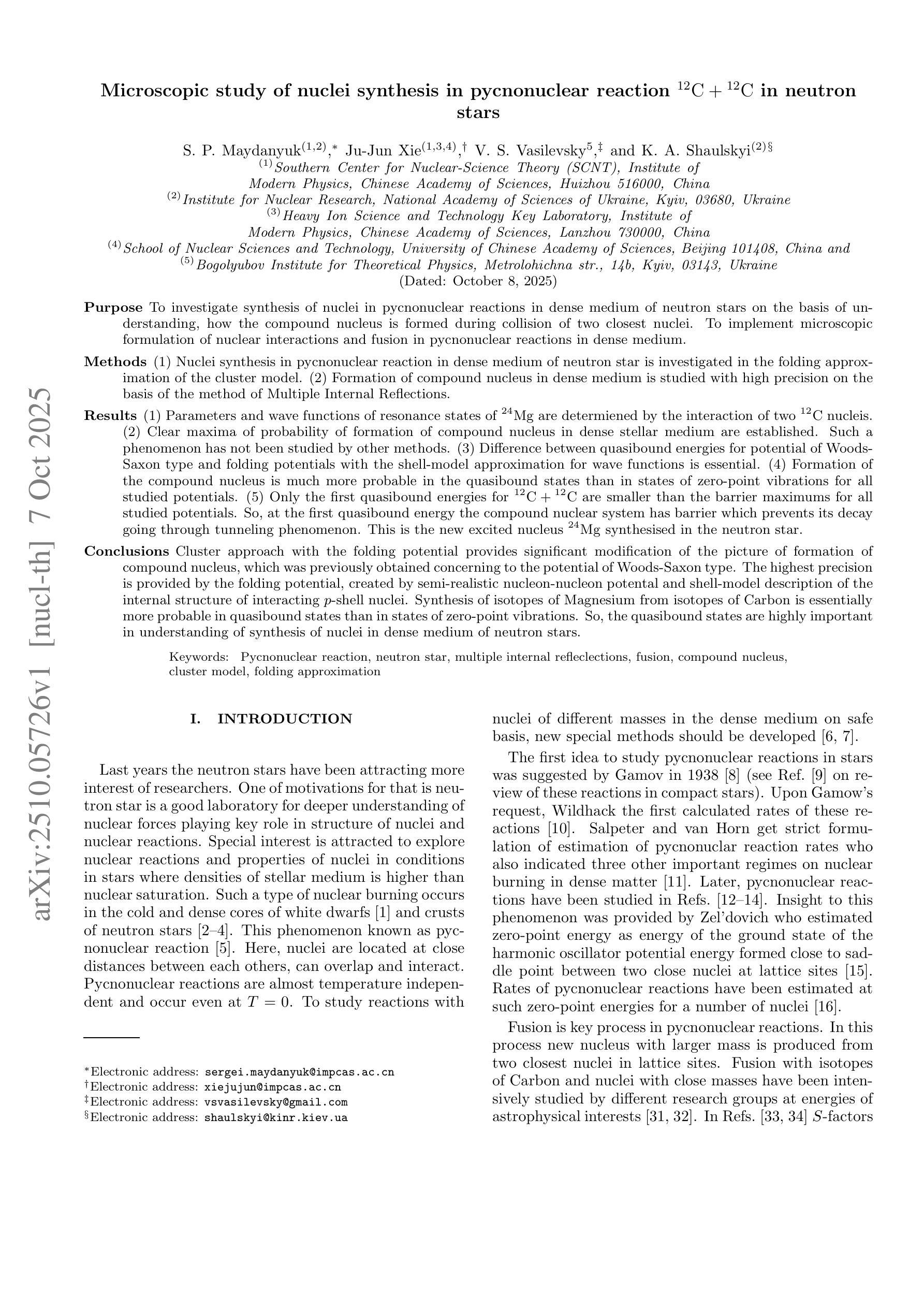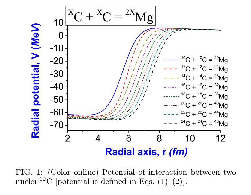 目的:在理解两个核碰撞过程中复合核形成的基础上,探讨中子星致密介质中热核反应的核合成。实现在致密介质中热核反应的核相互作用和融合的微观表述。方法:(1)在团簇模型的折叠近似中研究中子星致密介质中热核反应的核合成。(2)采用多重内部反射法研究致密介质中复合核的形成。结果:(1)$^{24}$Mg的共振态波函数是由两个$^{12}$C核的相互作用所决定的。(2)首次明确建立了在致密恒星介质中形成复合核的概率最大值。(3)Woods-Saxon型势与折叠势之间的准束缚能以及波函数的壳模型近似之间存在显著差异。(4)在准束缚态下形成复合核的可能性远大于在零点振动态下。(5)只有$^{12}$C和$^{12}$C的第一准束缚能小于势垒最大值。在这些能量下,复合核系统具有通过隧道效应防止其衰变的势垒。这是在中子星中合成的新激发态核$^{24}$Mg。结论:采用折叠势的团簇方法显著改变了先前关于Woods-Saxon型势所得到的复合核形成图像。最高精度是由半现实核子-核子势和p壳核内部结构壳模型描述所创建的折叠势提供的。