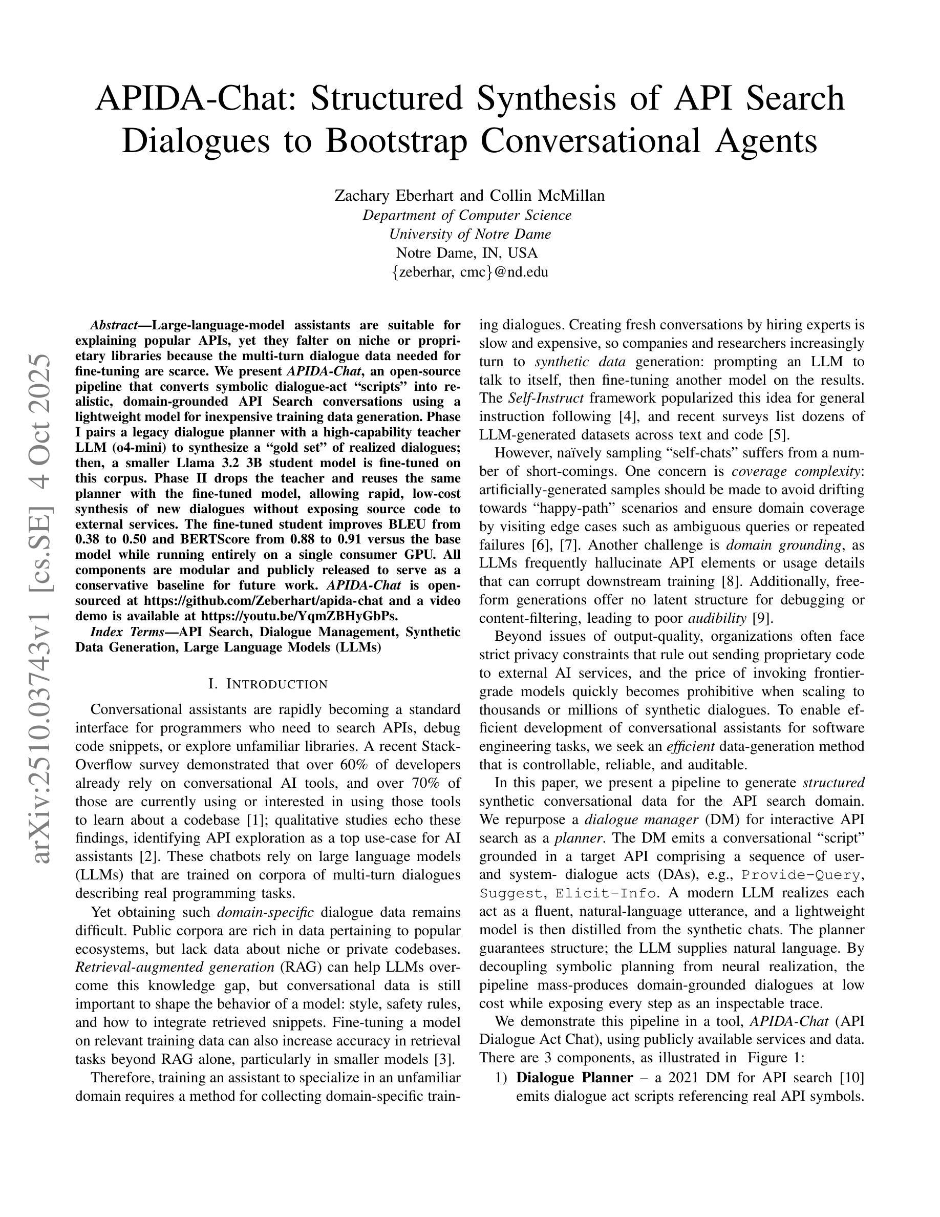 大型语言模型助手在解释流行API方面表现出色,但在小众或专有库方面表现不佳,因为缺乏微调所需的多轮对话数据。我们推出了APIDA-Chat,一个开源管道,能将符号对话行为“剧本”转化为现实、基于领域的API搜索对话,使用轻型模型进行低成本训练数据生成。第一阶段将传统的对话规划器与高性能教师LLM(o4-mini)配对,合成“黄金集”对话;然后,在语料库上微调较小的Llama 3.2 3B学生模型。第二阶段放弃教师,仅使用规划器和微调过的模型,可在不向外部服务暴露源代码的情况下快速、低成本地合成新对话。经过微调的学生模型相较于基础模型,BLEU得分从0.38提升至0.50,BERTScore从0.88提升至0.91,并且可在单个消费者GPU上完全运行。所有组件模块化并公开发布,作为未来工作的保守基线。APIDA-Chat已在GitHub上开源,视频演示可在YouTube上观看。