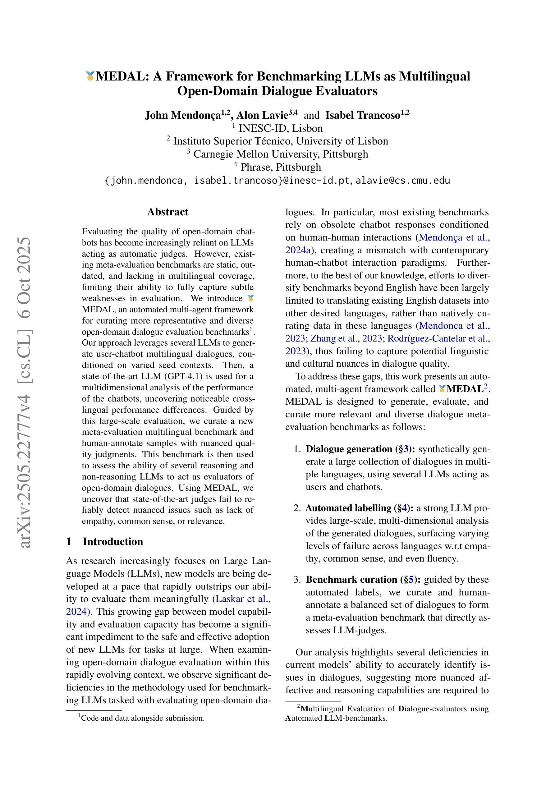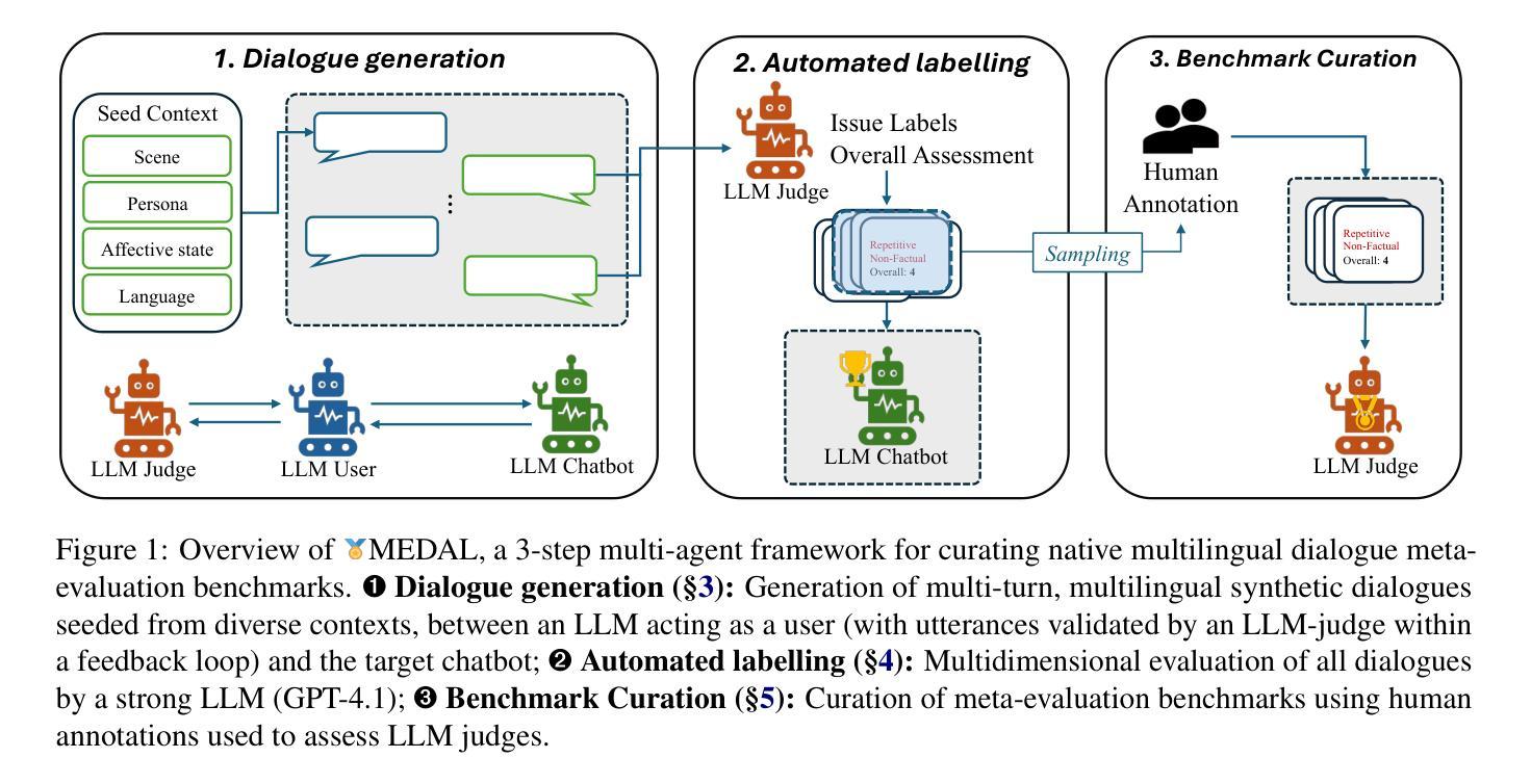 评估开放领域聊天机器人的质量越来越依赖于作为自动评委的大型语言模型(LLMs)。然而,现有的元评估基准测试是静态的、过时的,并且缺乏多语言覆盖,限制了它们全面捕捉评估中细微弱点的能力。我们引入了 MEDAL,这是一个自动化的多智能体框架,用于创建更具代表性和多样性的开放领域对话评估基准测试。我们的方法利用若干最先进的LLMs来生成基于各种种子上下文的用户聊天机器人多语言对话。然后,一个强大的LLM(GPT-4.1)用于对聊天机器人的性能进行多维分析,揭示出明显的跨语言性能差异。在大型评估的指导下,我们创建了一个新的元评估多语言基准测试,并对样本进行了微妙的质量判断进行人工标注。然后,使用这个基准测试来评估多个推理和非推理LLMs作为开放领域对话评估者的能力。使用 MEDAL,我们发现最先进的评委无法可靠地检测到诸如缺乏同理心、常识或相关性等细微问题。
