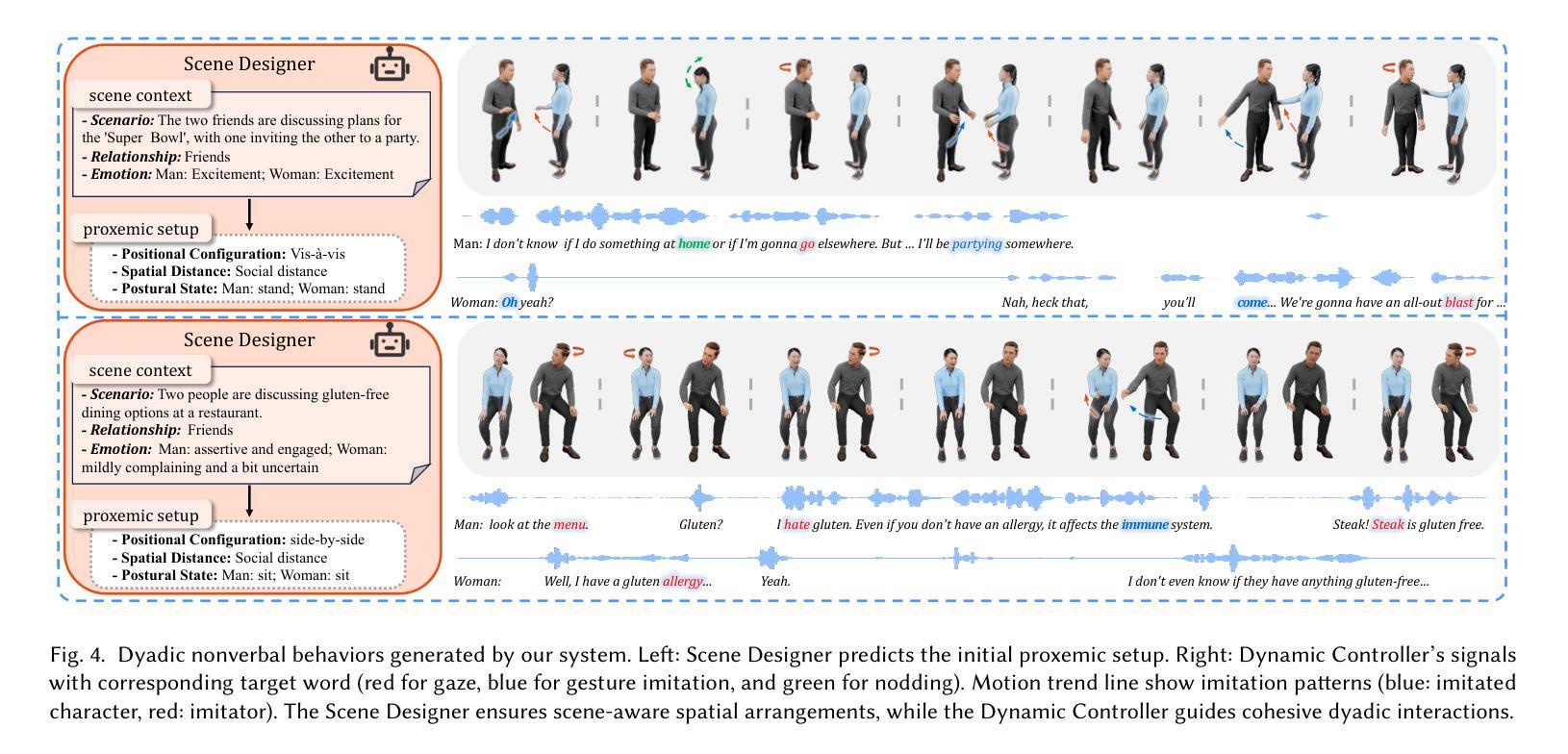 社交代理框架,用于合成现实且语境恰当的对话中的非言语行为。提出一个由大型语言模型驱动的代理系统,用于指导对话流程并确定双方适当的交互行为。此外,提出了基于自回归扩散模型的双人姿态生成模型,从语音信号中合成协调动作。代理系统的输出被转化为对姿态生成器的高级指导,实现了行为和动作级别的逼真动作。此外,代理系统会不时检查对话者的动作并推断其意图,形成一个持续的反馈循环,使两个参与者之间的交互更加动态和响应性。用户研究和定量评估表明,该模型显著提高了双人交互的质量,产生了自然、同步的非言语行为。