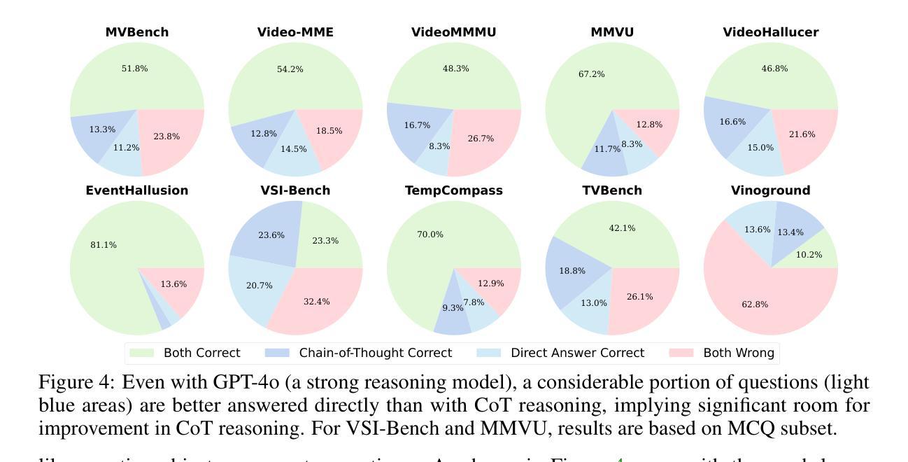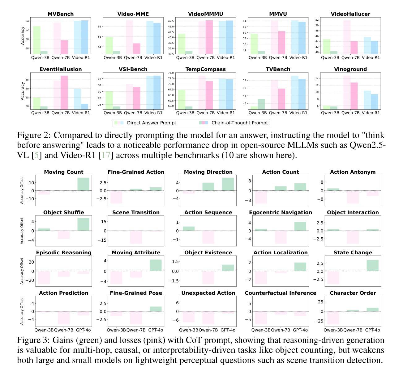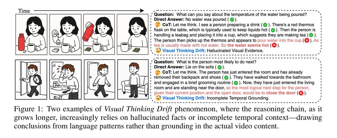 - CoT在视频推理中可能导致性能下降,出现“视觉思考漂移”现象。这种现象表现为模型生成冗长且误导的内部独白,导致虚构的视觉细节和覆盖正确的直觉。