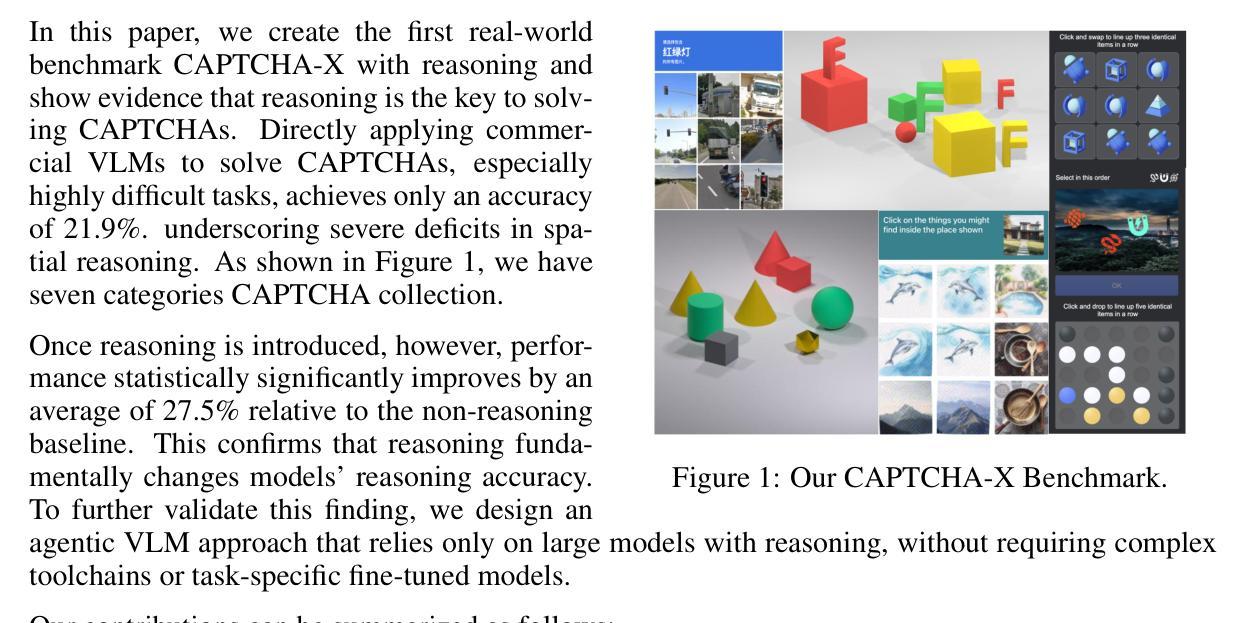 验证码(CAPTCHA)最初是为了区分人类和机器人而设计的,现已演变为评估视觉语言模型空间推理能力的现实世界基准测试。在这项工作中,我们首先展示了逐步推理对于视觉语言模型(VLM)解决验证码(代表高难度空间推理任务)至关重要,并且当前的商业视觉语言模型仍然难以应对此类推理。特别地,我们观察到大多数商业VLM(例如双子座、克劳德、GPT等)无法解决验证码问题,因此准确率很低(约为21.9%)。然而,我们的研究结果表明,要求模型在生成最终坐标之前进行逐步推理可以显著提高解决验证码的准确性,这凸显了差距的严重性。为了系统地研究这个问题,我们引入了CAPTCHA-X,这是第一个具有推理功能的现实世界的CAPTCHA基准测试,涵盖了七种验证码类别(如Gobang、hCaptcha等),具有逐步行动解决方案和接地注释。我们进一步定义了五个面向推理的指标,能够对模型的推理能力进行全面评估。为了验证推理的有效性,我们还提出了一个基于通用代理的VLM框架,该框架结合了模型固有的推理能力。我们的方法在五种高难度CAPTCHA类型上实现了最先进的性能,平均解决准确率为83.9%,大大超过了现有基线。这些结果揭示了当前模型的局限性,并强调了未来在视觉空间挑战中推理的重要性。