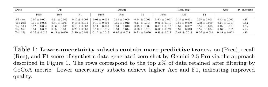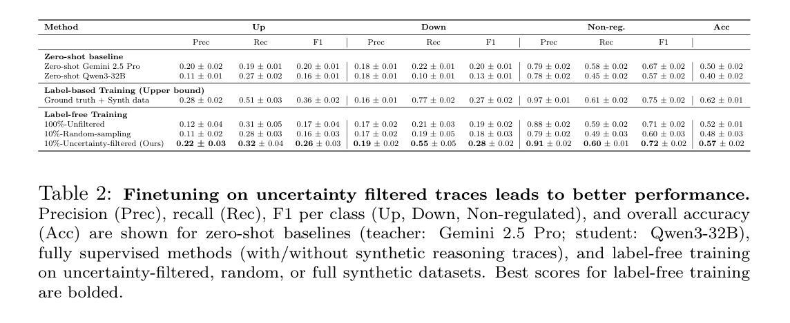 合成思维链(CoT)轨迹广泛应用于训练大型推理模型(LRM),通过提供步骤级监督来提高泛化能力。然而,大多数方法都需要真实标签来播种或过滤这些轨迹,这在生物学等领域是一个昂贵的瓶颈,因为湿实验室数据非常稀缺。我们提出了一种无标签的替代方案:基于不确定性的过滤,它使用模型本身的信心——通过已建立的不确定性度量指标(如自我一致性和预测困惑度)进行量化,作为外部标签的替代品。我们对多个推理轨迹进行采样,仅保留低不确定性的子集。在生物扰动预测领域应用,这是一个湿实验室标签特别昂贵的应用领域,我们证明了过滤后的子集具有更高的准确性,并且在不确定性过滤数据上进行监督微调(SFT)优于未过滤的合成数据,缩小了与真实训练数据的差距,并超越了强大的LRM基线。消融实验表明,按类别过滤可以纠正特定类别的不确定性规模,混合不确定性度量指标可以生成更高质量的数据集。我们的结果表明,模型内部信心是一个强大的信号,可用于有效地创建推理数据集,使监督成本高昂的领域也能使用大型推理模型。