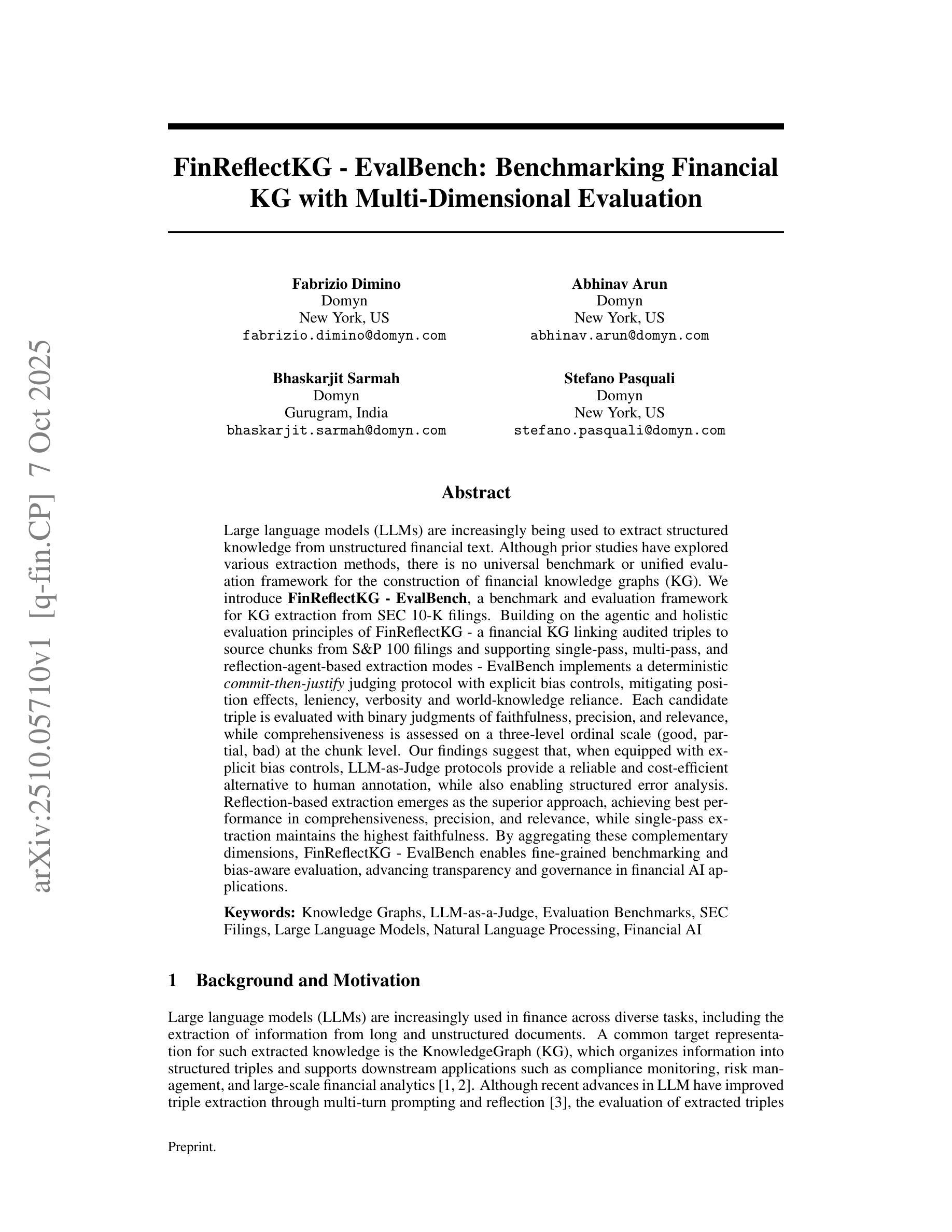 本文介绍了金融领域知识图谱构建的新基准评价体系——FinReflectKG-EvalBench。该框架从SEC 10-K文件中提取结构化知识,并采用确定性评判协议,对候选三元组进行忠实度、精确度和相关性的二元判断,同时对片段级别的完整性进行三级评估。研究表明,在明确的偏见控制下,LLM-as-Judge协议为可靠且经济的替代人工标注方法,并可进行结构化错误分析。其中,反射型提取方式展现出最佳的完整性、精确度和相关性,而单遍提取保持最高忠实度。通过聚合这些互补维度,FinReflectKG-EvalBench推动了金融AI应用的透明性和治理进步。