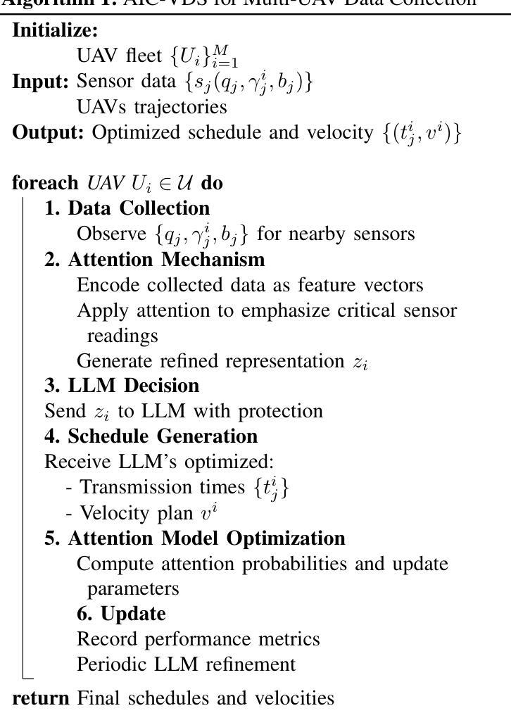 近期,无人飞行器(UAVs)在灾后监测场景中的感官数据收集越来越受到关注,例如在海啸等灾难中,早期行动对于限制沿海破坏至关重要。一个主要挑战是设计数据收集计划和飞行速度,因为不利的时间和速度设置会导致地面传感器的传输错误和缓冲区溢出,最终造成重大数据包丢失。同时,在线深度强化学习(DRL)解决方案存在训练过程复杂以及在仿真与现实之间存在不匹配的问题,无法满足海啸监测的紧迫需求。最近的大型语言模型(LLM)的进步提供了一个吸引人的替代方案。凭借强大的推理和泛化能力,LLM可以通过上下文学习(ICL)适应新任务,通过自然语言提示和基于示例的指导来适应任务,无需重新训练。然而,LLM模型存在输入数据限制,因此需要定制的方法。在本文中,提出了一种对多个无人飞行器的数据收集计划和速度控制的联合优化方案,以最小化数据丢失。考虑到地面传感器的电池水平、队列长度、信道条件以及无人飞行器的轨迹。提出基于注意力的上下文学习用于速度控制和数据收集计划(AIC-VDS)作为紧急情况中DRL的替代方案。仿真结果表明,所提出的AIC-VDS在性能上优于深度Q网络(DQN)和最大信道增益基线。