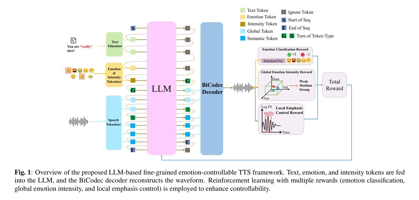 近期LLM-based的TTS系统具有强大的性能和零发射能力,但在精细情绪控制方面存在不足,主要因为依赖于离散语音令牌。现有方法要么限制情绪为类别标签,要么无法推广到基于LLM的架构。本研究提出EMORL-TTS(结合强化学习的精细情绪控制TTS),将全局强度控制与VAD空间的局部强调调节相结合。本研究方法结合了监督微调与强化学习,由针对情绪类别、强度和重点的任务特定奖励引导。此外,本研究还深入探讨了重点放置如何调节精细的情绪强度。实验表明,EMORL-TTS提高了情绪准确性、强度差异和重点清晰度,同时保持了与强大的LLM基线相当的综合质量。