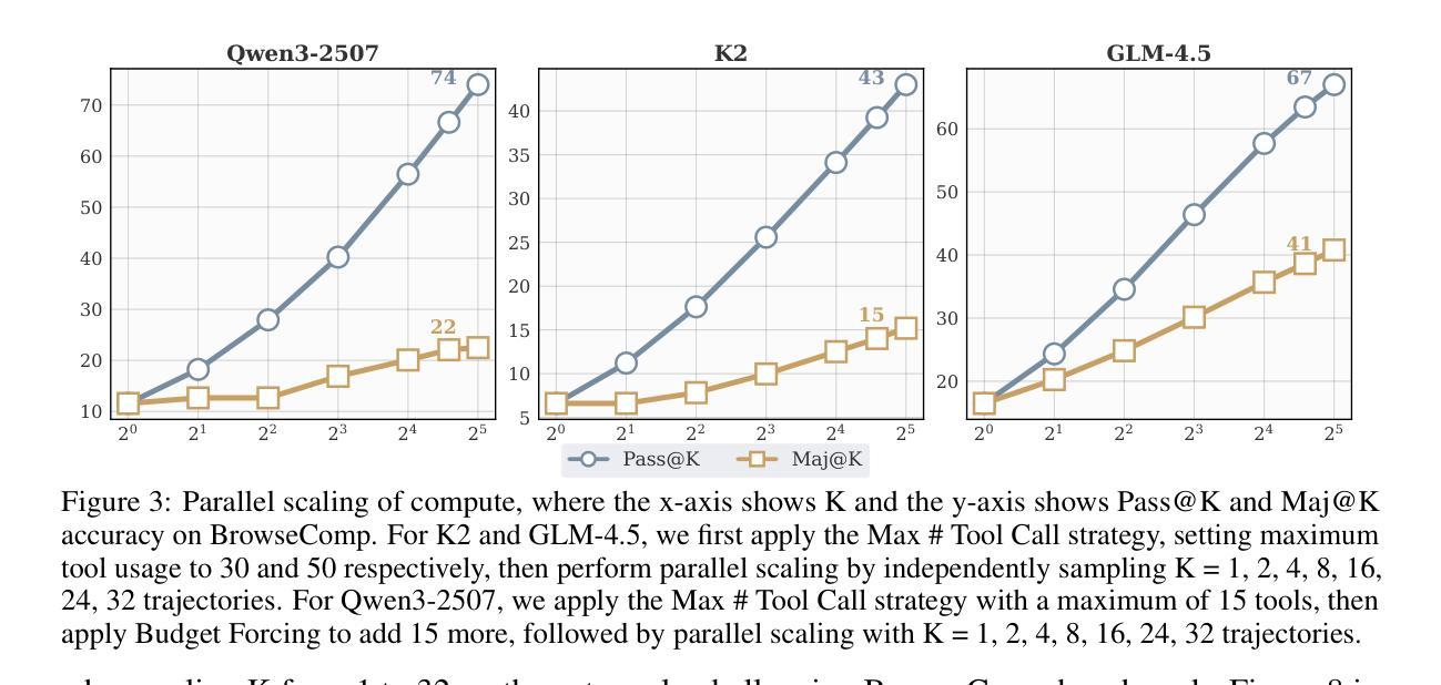 测试时计算可通过序列和平行两种方式进行扩展。序列扩展通过延长生成过程,而平行扩展则通过验证和选择多个候选输出。结合这两种策略,诞生了最强大的AI系统,如Grok 4 Heavy和GPT-5 Pro。在某些情况下(例如解决数独谜题),验证答案可能比生成答案更容易,这种现象被称为不对称验证,突显了测试时扩展的强大潜力。本研究探讨了深度搜索代理的序列和并行测试时扩展,受到此设置中验证通常比生成更容易的直觉的启发。实验表明,序列扩展方法(如预算强制)虽然初期有效,但很快就会降低性能。利用不对称验证,我们只需为验证器分配很少的计算资源,就能实现显著改进。我们使用开源模型进行实验,并通过测试时扩展将其扩展到“重型”变体。这些深度研究代理在BrowseComp等基准测试上实现了高达27个绝对点的收益。值得注意的是,作为开源替代品,GLM-4.5 Heavy在BrowseComp上达到了54.0%的准确率,在GAIA上达到了66.0%,与最佳专有选择如OpenAI Deep Research相当。Tongyi-DeepResearch Heavy在BrowseComp上的准确率更是达到了惊人的69.0%,大大超过了最佳专有结果。