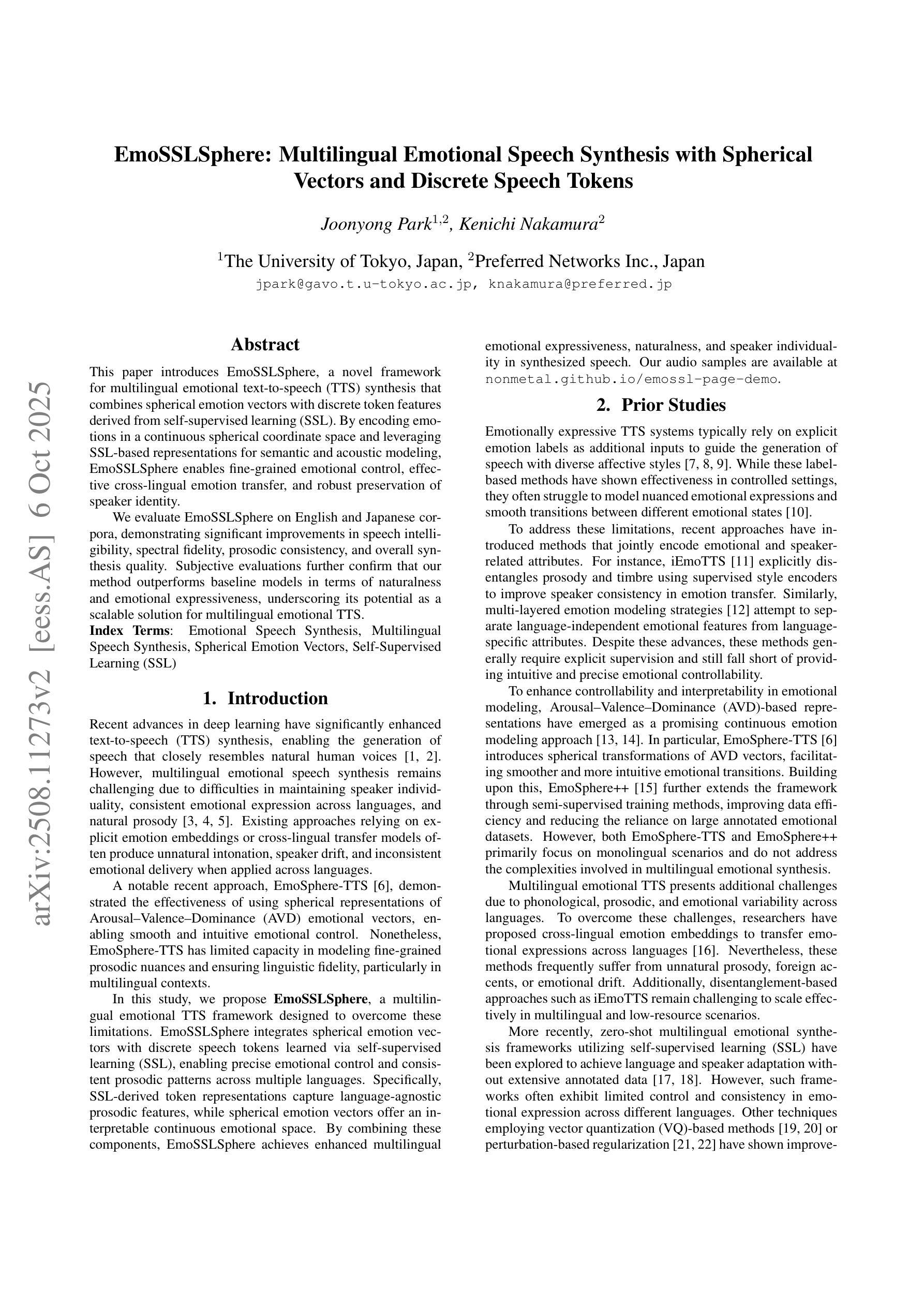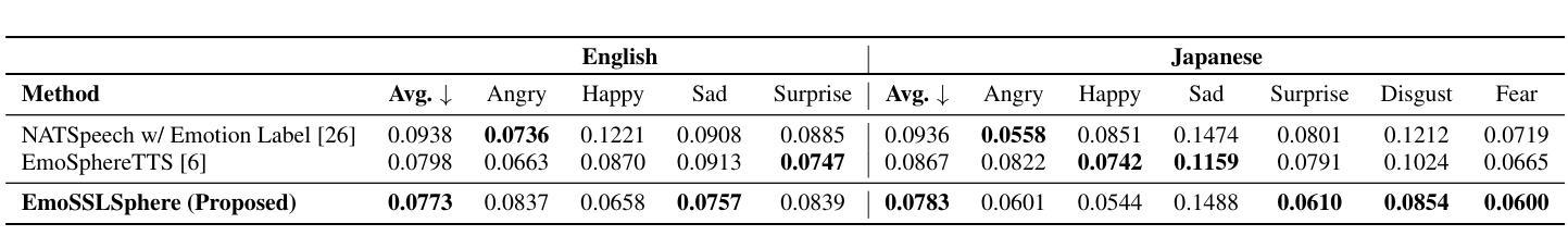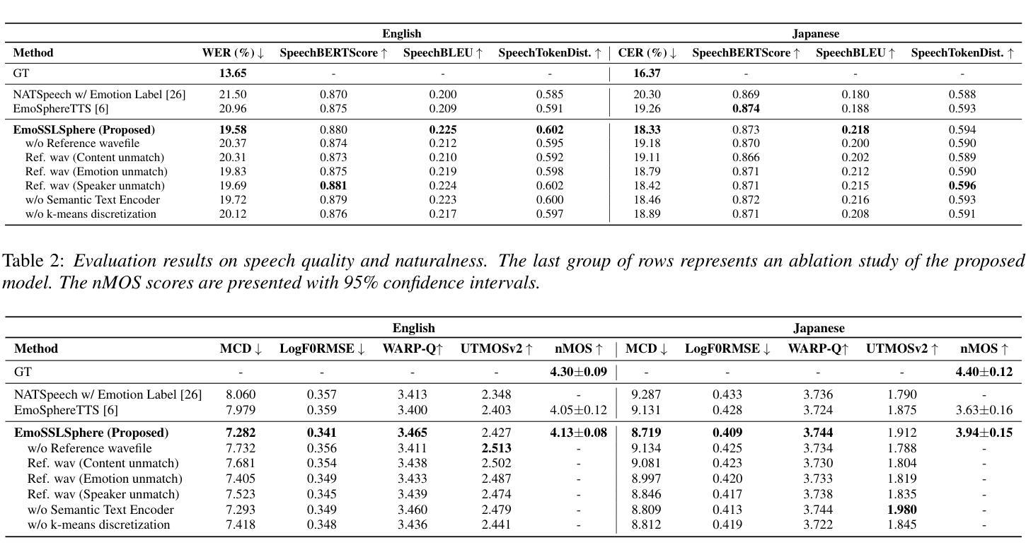 - 在英语和日语语料库上的评估表明,EmoSSLSphere在语音清晰度、频谱保真度等方面有显著提高。