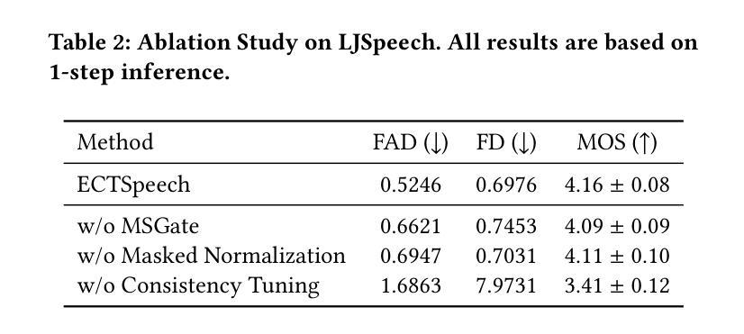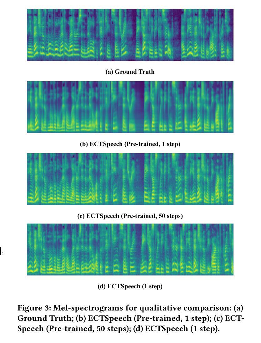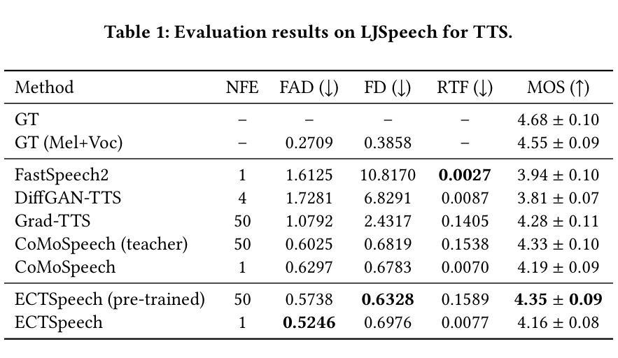 - 在LJSpeech数据集上的实验结果表明ECTSpeech在单步采样下达到音频质量与最先进方法相当。