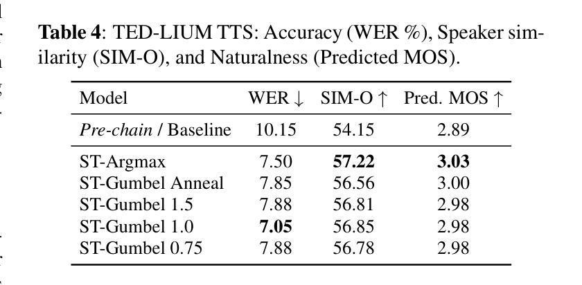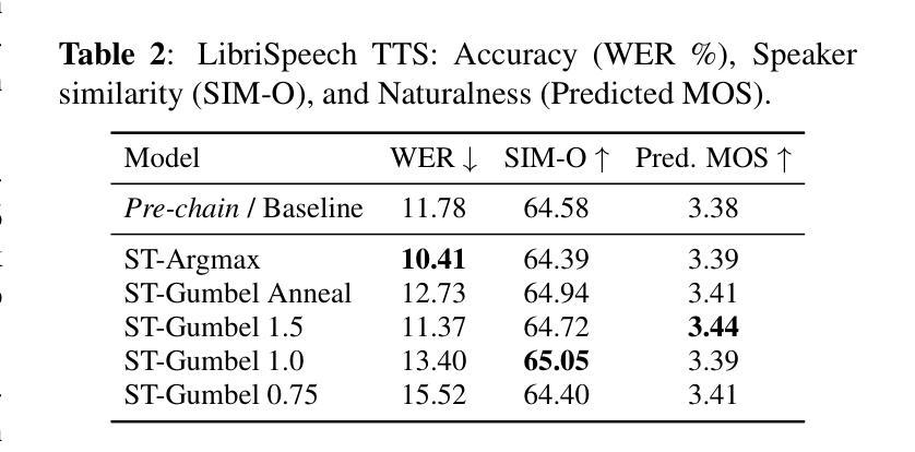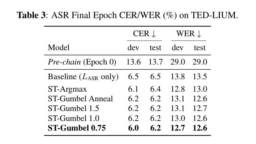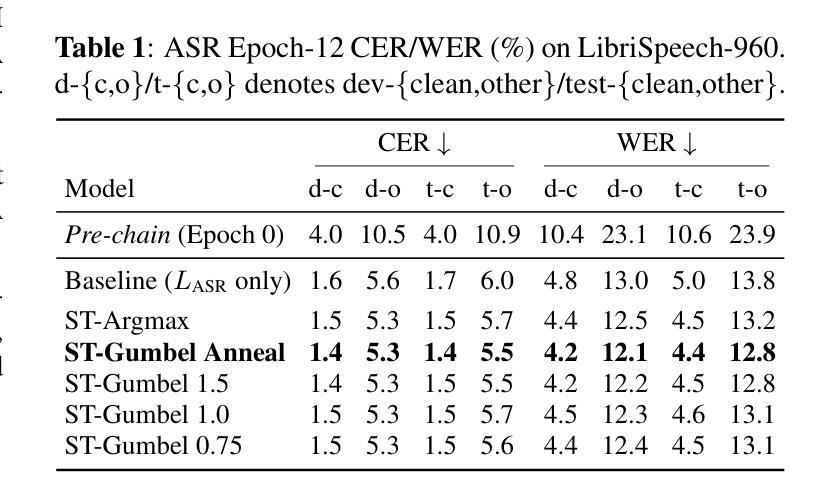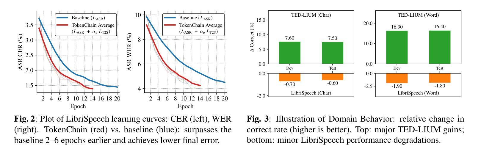 模拟人类感知-生产循环的机器语音链,在联合改进语音识别(ASR)和文本转语音(TTS)方面表现出良好的效果。我们提出了TokenChain,这是一个完全离散的语音链,通过语义令牌将ASR与两阶段TTS耦合:一个与ASR联合训练的autoregressive文本到语义模型和一个仅用于合成的masked-generative语义到声学模型。通过直通argmax/Gumbel-Softmax在文本接口实现端到端反馈,并通过动态权重平均与监督ASR进行平衡。消融研究检查了跨域迁移的最佳温度计划。评估结果显示,TokenChain在LibriSpeech上的准确性超过了基线模型,并在2-6个周期内取得了优势,在相同周期内的误差降低了5-13%,并且语音转文本(T2S)表现稳定。在TED-LIUM上,TokenChain相对降低了语音识别(ASR)的WER(词错误率)56%,并降低了T2S的WER(词错误率)31%,且几乎不会遗忘,这表明链学习在令牌接口和模型中仍然有效。