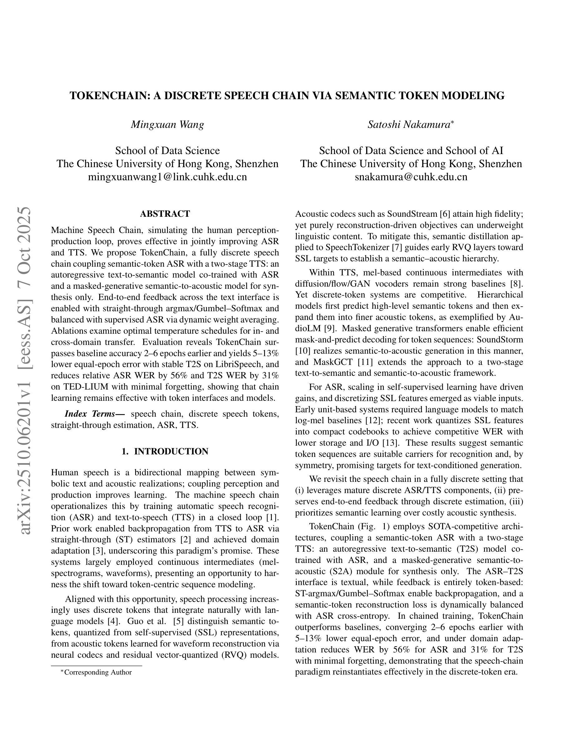 机器语音链模拟人类感知-生产循环,通过联合改进语音识别和文本转语音技术,证明其有效性。提出TokenChain,一个完全离散的语音链,将语义令牌语音识别与两阶段文本转语音相结合:与语音识别联合训练的autoregressive文本到语义模型和仅用于合成的masked-generative语义到音频模型。通过straight-through argmax/Gumbel-Softmax实现端到端文本界面反馈,并通过动态权重平均与监督语音识别进行平衡。消融实验研究了域内和跨域转移的最佳温度调度。评估显示,TokenChain在LibriSpeech上的准确度超过基线2-6个周期,具有稳定的T2S,相同周期的错误率降低5-13%,在TED-LIUM上的相对语音识别字词错误率降低56%,T2S字词错误率降低31%,且模型在令牌接口下仍能保持有效。