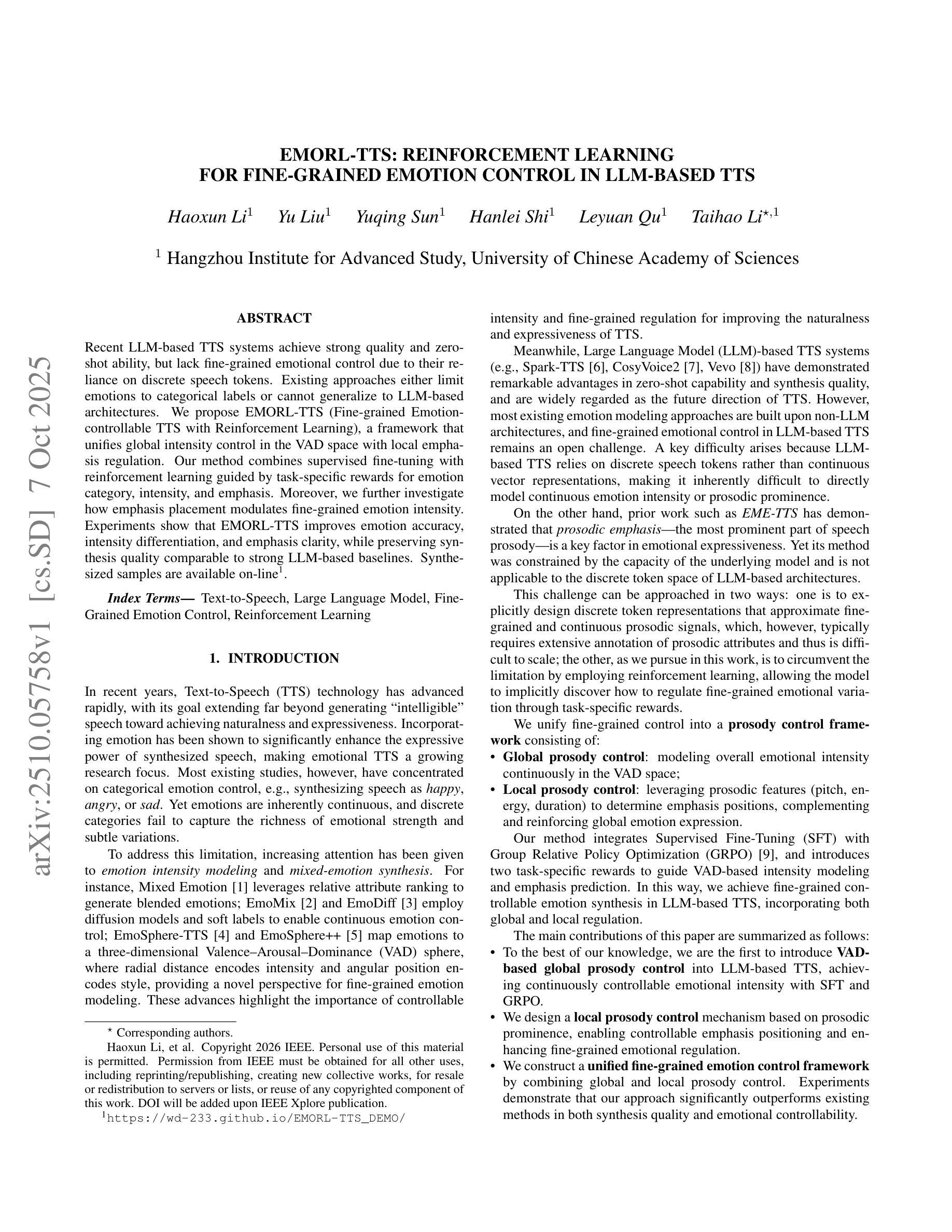 近期LLM-based的TTS系统具有强大的性能和零发射能力,但在精细情绪控制方面存在不足,主要因为依赖于离散语音令牌。现有方法要么限制情绪为类别标签,要么无法推广到基于LLM的架构。本研究提出EMORL-TTS(结合强化学习的精细情绪控制TTS),将全局强度控制与VAD空间的局部强调调节相结合。本研究方法结合了监督微调与强化学习,由针对情绪类别、强度和重点的任务特定奖励引导。此外,本研究还深入探讨了重点放置如何调节精细的情绪强度。实验表明,EMORL-TTS提高了情绪准确性、强度差异和重点清晰度,同时保持了与强大的LLM基线相当的综合质量。