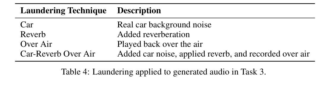 - 该框架包含三种任务:原始合成语音、经过处理的音频(如压缩、重采样)以及旨在规避法医分析的伪装音频。