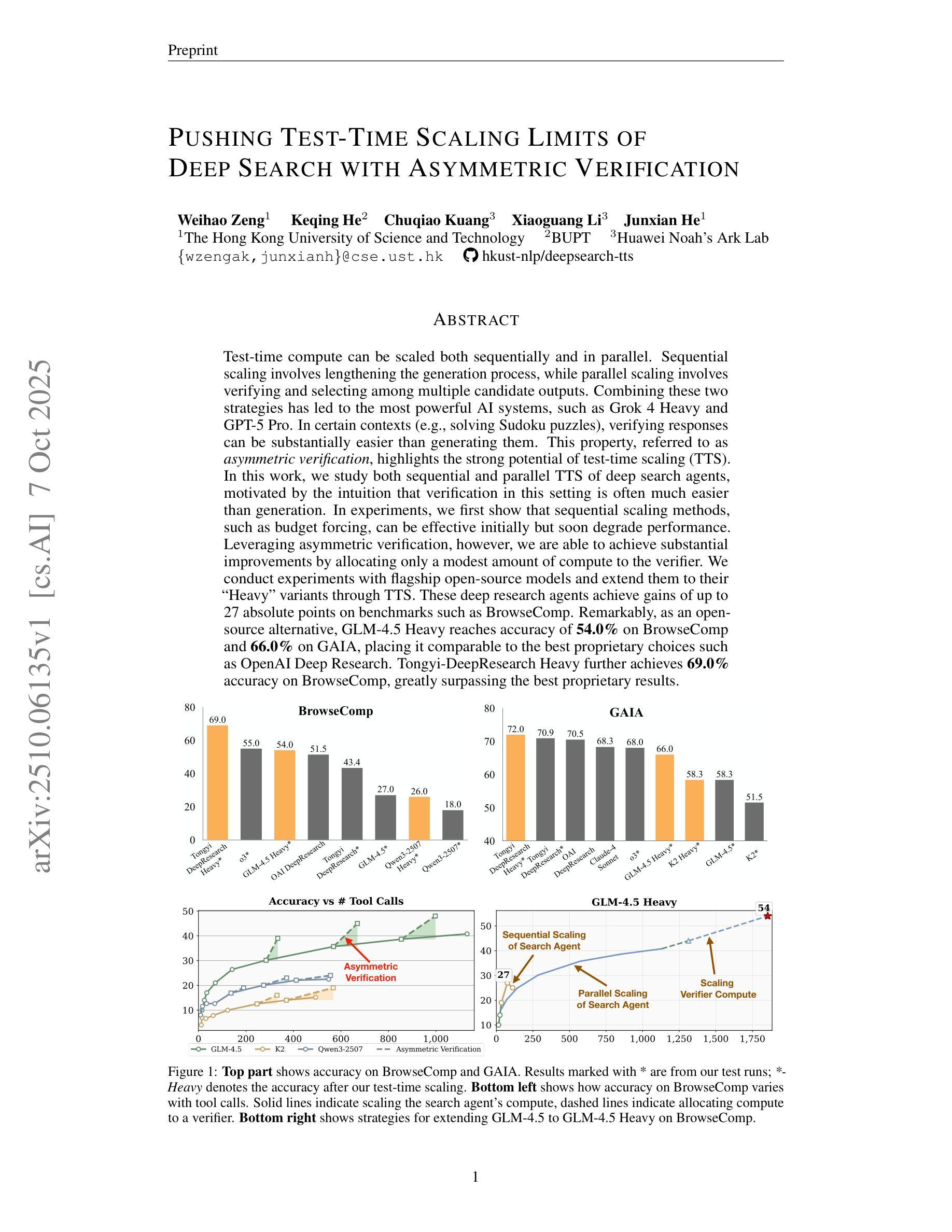 测试时的计算可以进行顺序和并行两种扩展。顺序扩展涉及延长生成过程,而并行扩展则涉及验证和选择多个候选输出。结合这两种策略,产生了最强大的AI系统,如Grok 4 Heavy和GPT-5 Pro。在某些情况下(例如解数独谜题),验证答案往往比生成答案更容易。这种特性被称为“不对称验证”,突出了测试时扩展(TTS)的强大潜力。在这项工作中,我们研究了深度搜索代理的顺序和并行TTS,我们的直觉是,在这种情况下验证通常比生成更容易。在实验中,我们首秀表明,顺序扩展方法(如预算强制)在初期可能有效,但很快就会降低性能。然而,利用不对称验证,我们只需为验证器分配适量的计算资源就能实现重大改进。我们使用旗舰开源模型进行实验,并通过TTS将其扩展到“重型”变体。这些深度研究代理在BrowseComp等基准测试上实现了高达27个绝对点的收益。值得注意的是,作为一个开源替代品,GLM-4.5 Heavy在BrowseComp上达到了54.0%的准确率,在GAIA上达到了66.0%的准确率,与最佳专有选择如OpenAI Deep Research相当。Tongyi-DeepResearch Heavy在BrowseComp上进一步达到了69.0%的准确率,大大超过了最佳专有结果。