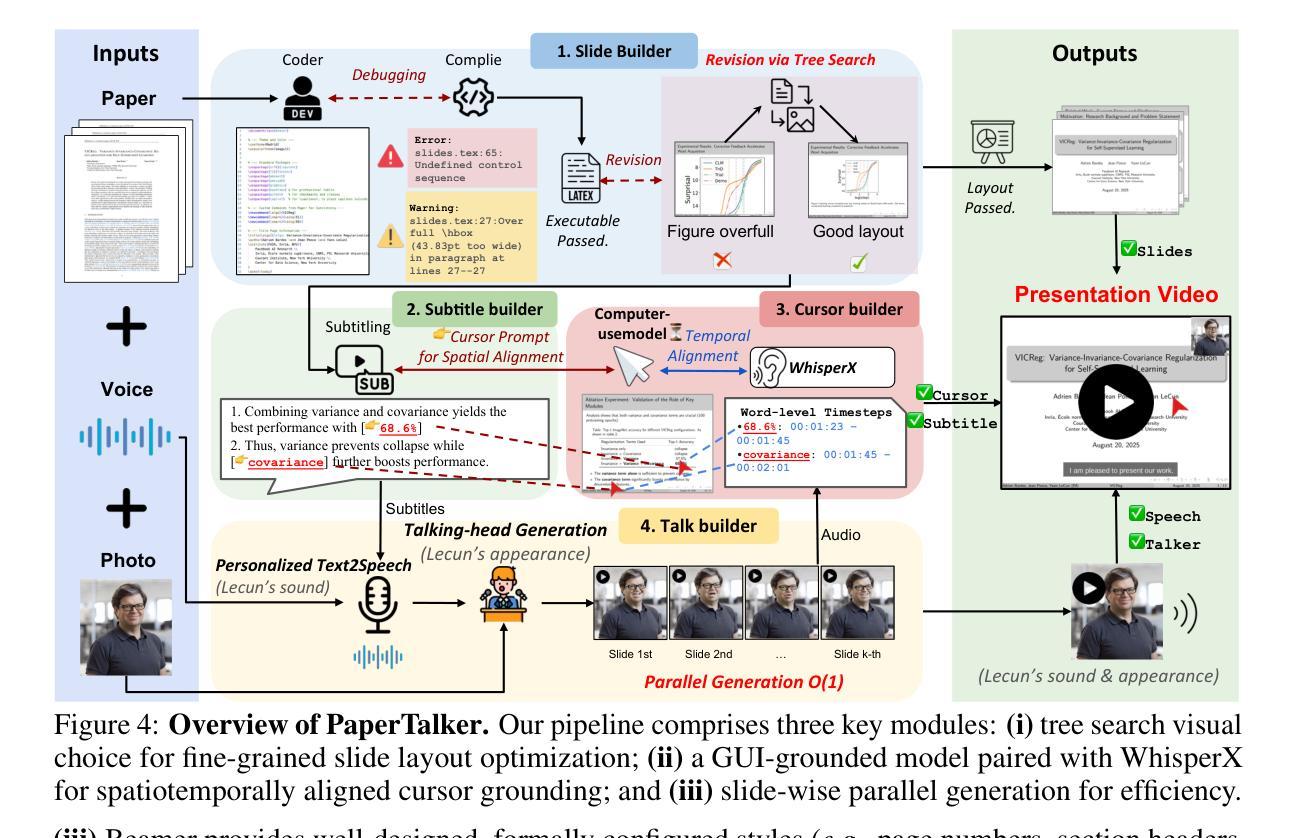 学术报告视频已成为研究沟通的重要媒介,但其制作仍然是一项劳动密集型活动,通常需要花费数小时的时间来设计和编辑一个短暂的视频,一般在2到10分钟之间。与一般的视频不同,演示视频生成面临独特的挑战:包括来自研究论文的输入、密集的多模态信息(文本、图表、表格),以及需要协调多个对齐的通道,如幻灯片、字幕、语音和人类说话者。为了应对这些挑战,我们推出了PaperTalker,这是第一个包含作者创建的演示视频、幻灯片以及发言人元数据的论文基准测试平台,包含一百零一篇研究论文。我们进一步设计了四个定制的评价指标——Meta相似性、PresentArena、PresentQuiz和IP记忆——来衡量视频向观众传达论文信息的效果。在此基础上,我们提出了首个学术报告视频生成的多智能体框架PaperTalker。它将幻灯片生成与有效的布局优化相结合,通过新颖的有效树搜索视觉选择、光标定位、字幕添加、语音合成和头部渲染等技术,同时并行进行幻灯片级别的生成以提高效率。在Paper2Video上的实验表明,我们的方法生成的报告视频比现有基线更忠实且更具信息量,朝着自动化和即用的学术视频生成方向迈出了实际的一步。我们的数据集、智能体和代码可在https://github.com/showlab/Paper2Video找到。