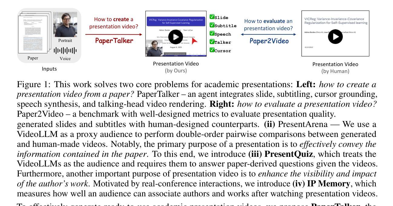 学术报告视频已成为研究交流的重要媒介,但其制作仍然是一项高度劳动密集的工作,通常需要数小时的幻灯片设计、录制和编辑才能制作出一个短短的2到10分钟的视频。与自然的视频不同,演示视频生成面临独特的挑战:来自研究论文的输入、密集的多模式信息(文本、图表、表格),以及需要协调多个对齐的通道,如幻灯片、字幕、语音和人类演讲者。为了解决这些挑战,我们推出了PaperTalker,这是第一个基准测试,包含101篇研究论文,以及与作者创作的演示视频、幻灯片和演讲者元数据配对。我们进一步设计了四个定制的评价指标——Meta相似性、PresentArena、PresentQuiz和IP记忆——来衡量视频向观众传达论文信息的效果。在此基础上,我们提出了PaperTalker,这是第一个学术报告视频生成的多代理框架。它将幻灯片生成与有效的布局优化相结合,通过新颖的有效树搜索视觉选择、光标定位、字幕、语音合成和谈话头部渲染等技术,同时并行幻灯片级的生成以提高效率。在Paper2Video上的实验表明,我们的方法生成的报告视频比现有基准测试更忠实和富有信息,朝着自动化和即插即用的学术视频生成迈出了实际的一步。我们的数据集、代理和代码可在https://github.com/showlab/Paper2Video上找到。
