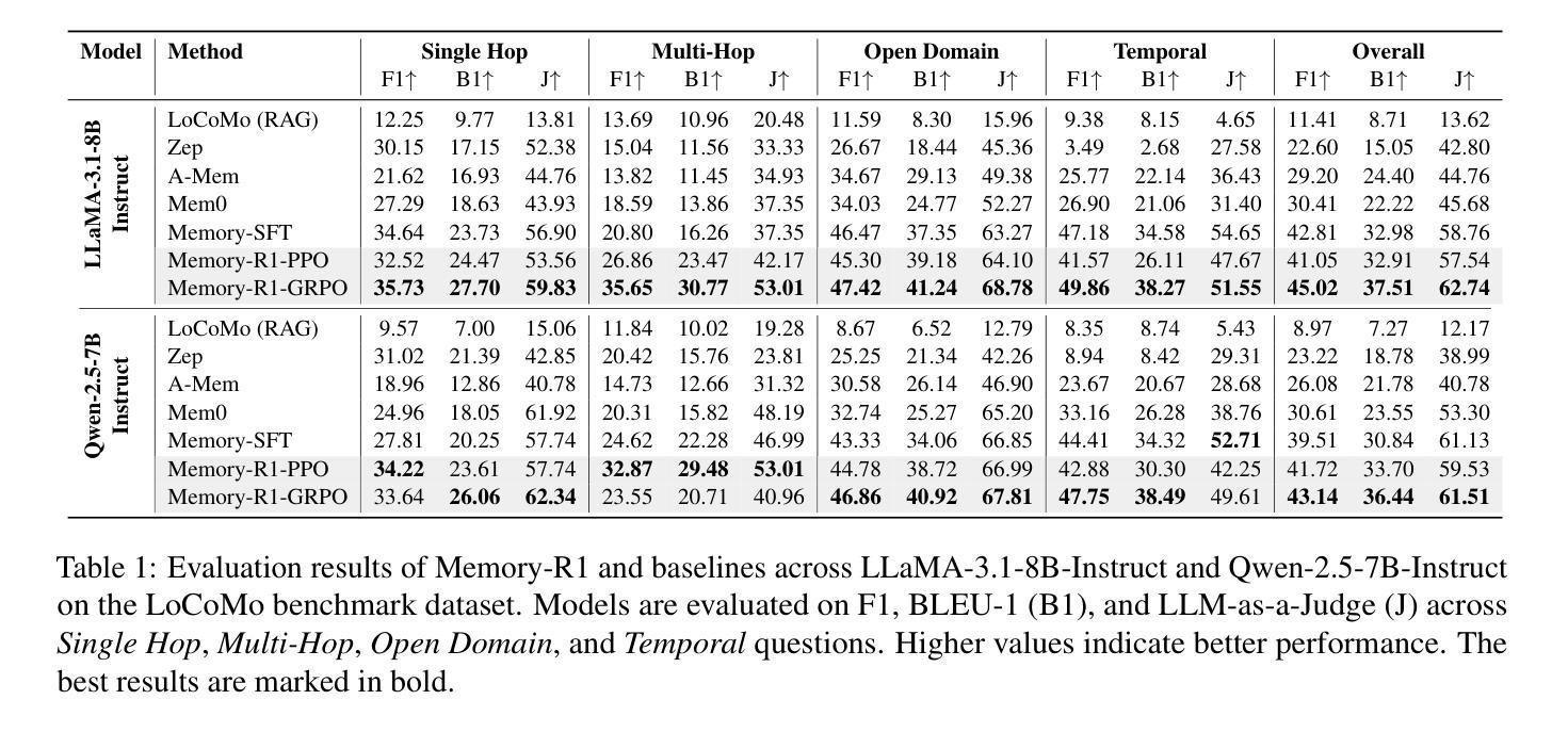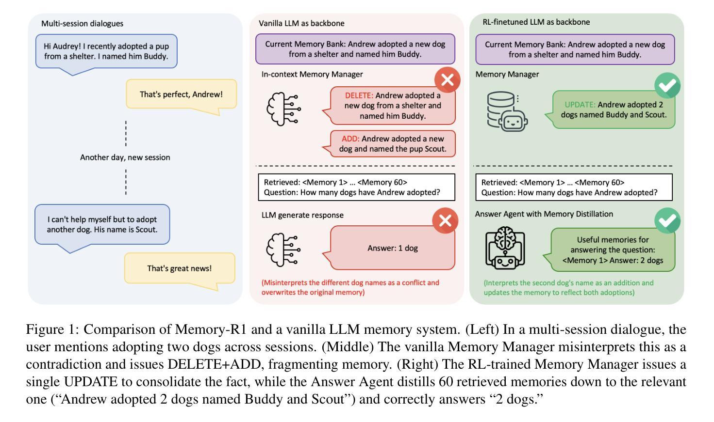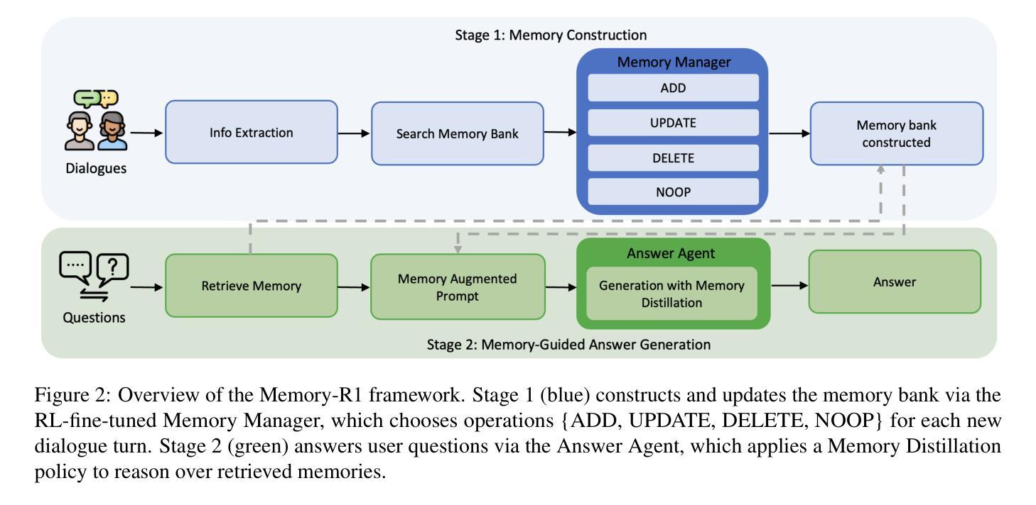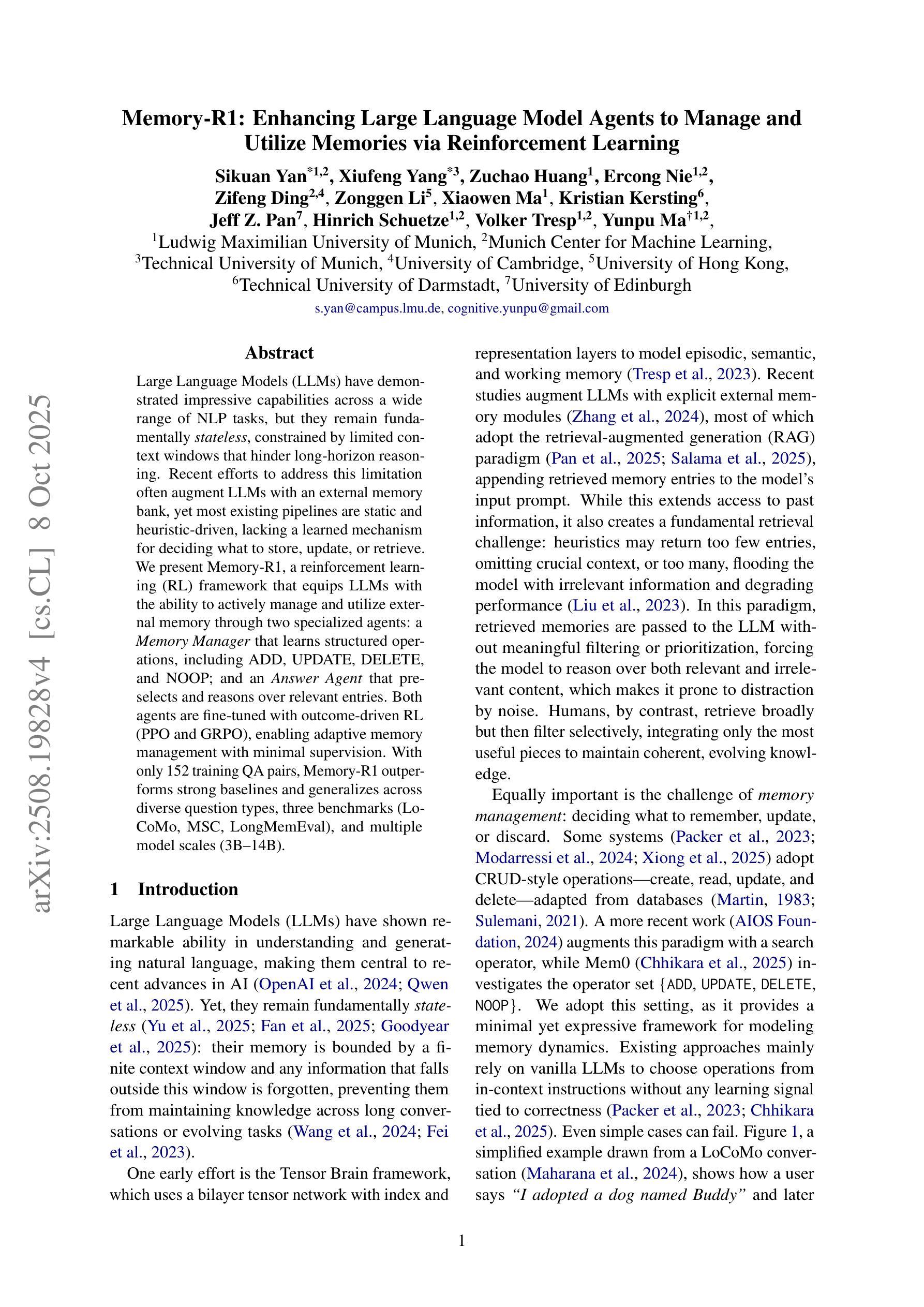 大型语言模型(LLMs)在多个NLP任务中展现出强大的能力,但其本质上是无状态的,受限于有限的上下文窗口,影响长期推理。最近的研究尝试通过外部记忆库来增强LLMs,但现有管道多为静态、启发式驱动,缺乏学习机制来决定存储、更新或检索的内容。本研究提出Memory-R1,一种强化学习(RL)框架,通过两个专门代理——内存管理器(学习结构操作,如添加、更新、删除和空操作)和答案代理(预先选择和推理相关条目),使LLMs能够主动管理和利用外部记忆。两个代理均采用结果驱动的RL(PPO和GRPO)进行微调,实现自适应内存管理,监督需求最小。仅使用152对训练问答,Memory-R1表现优于强大基线,并在多个问题类型、三个基准(LoCoMo、MSC、LongMemEval)和多种模型规模(3B-14B)上实现泛化。
