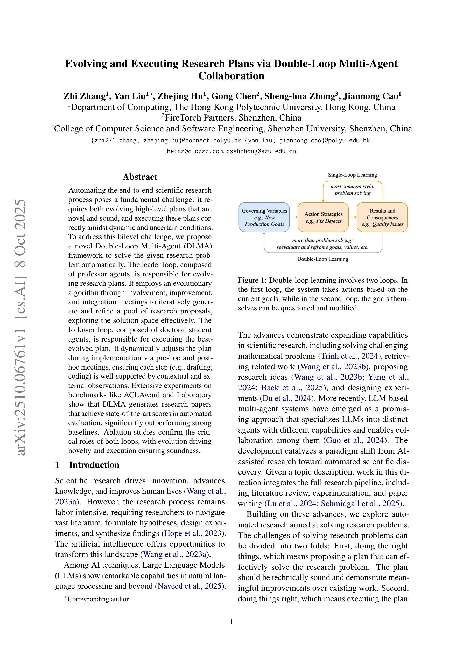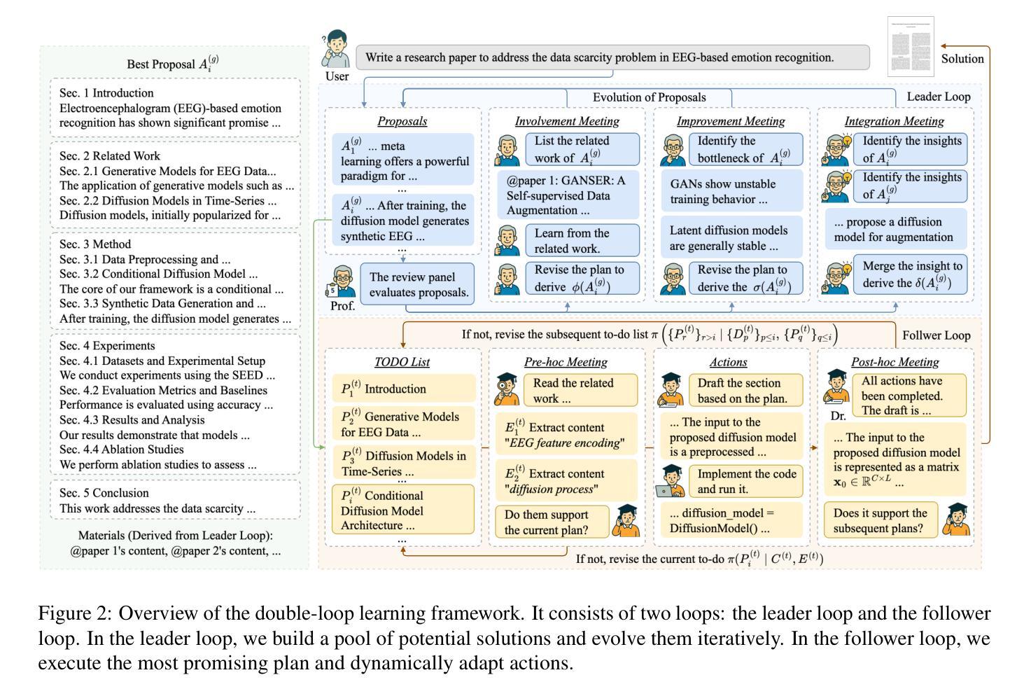 自动化端到端的科学研究过程带来了一个根本性的挑战:它需要不断发展和完善新颖且合理的计划,并在动态和不确定的条件下正确执行这些计划。为了应对这一双重挑战,我们提出了一种新型的双循环多智能体(DLMA)框架来自动解决给定的研究问题。由教授智能体组成的领导者循环,负责发展研究计划。它通过参与、改进和整合会议来不断迭代生成和优化研究方案池,有效地探索解决方案空间。由博士生智能体组成的追随者循环,负责执行最佳发展方案。它通过预设会议和后续会议来动态调整实施过程中的计划,确保每一步(如起草、编码等)都得到上下文和外部观察的有力支持。在ACLAward和实验室等基准测试上的大量实验表明,DLMA生成的研究论文在自动评估中取得了最先进的分数,显著优于强基线。消融研究证实了这两个循环的关键作用,其中进化驱动新颖性,执行确保合理性。