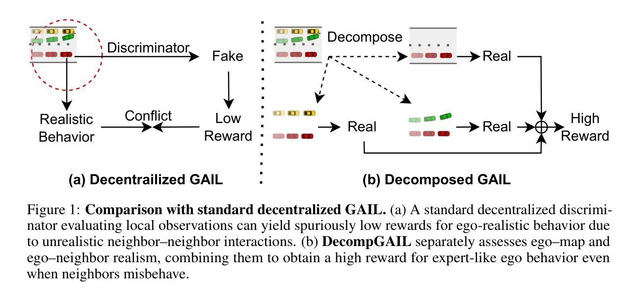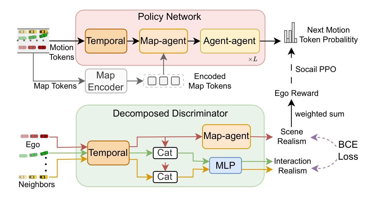 现实交通模拟对于自动驾驶系统和城市流动规划的发展至关重要,但现有的模仿学习法往往无法模拟真实的交通行为。行为克隆面临协变量偏移问题,而生成对抗性模仿学习(GAIL)在多智能体环境中极为不稳定。为解决这一问题,我们提出分解多智能体GAIL(DecompGAIL),它将真实主义分解为自我地图和自我邻居的组成部分,过滤掉误导性的邻居与邻居和邻居与地图的互动。此外,我们还引入了社会PPO目标,通过距离加权邻居奖励来增强自我奖励,鼓励整体的真实主义跨智能体。融入轻量级SMART基础架构,DecompGAIL在WOMD Sim Agents 2025基准测试中取得最佳性能。