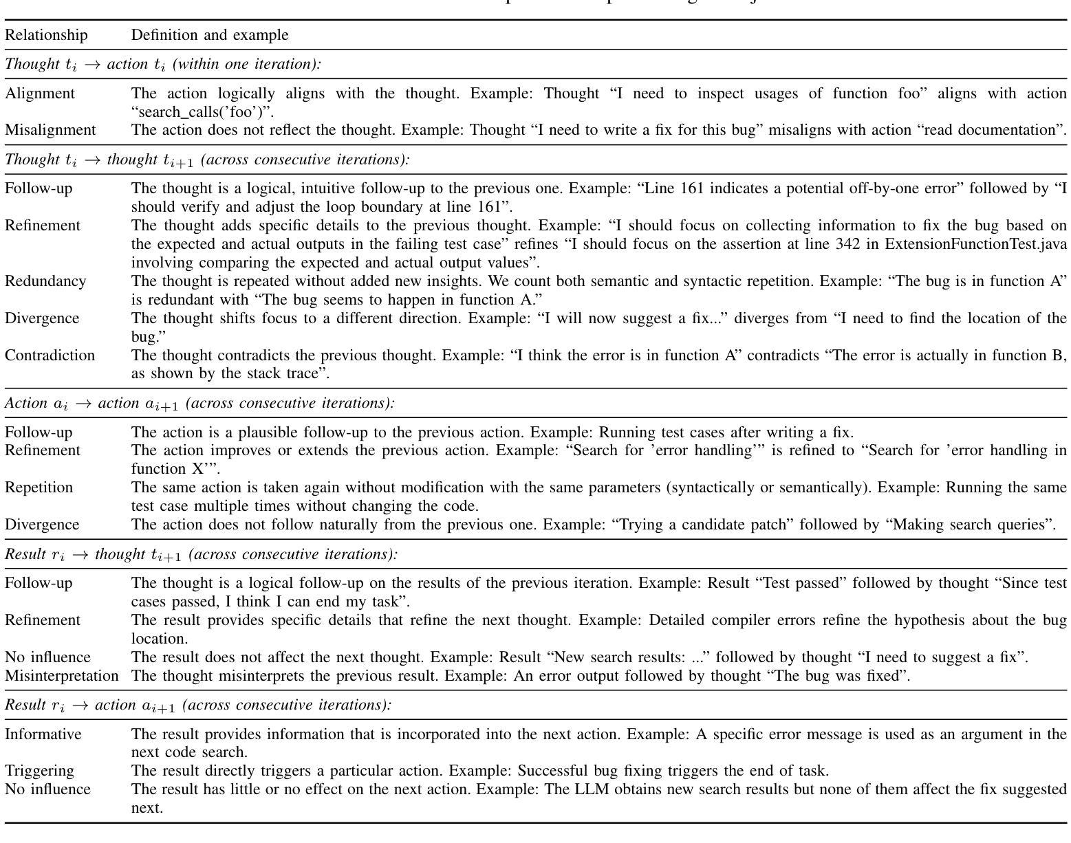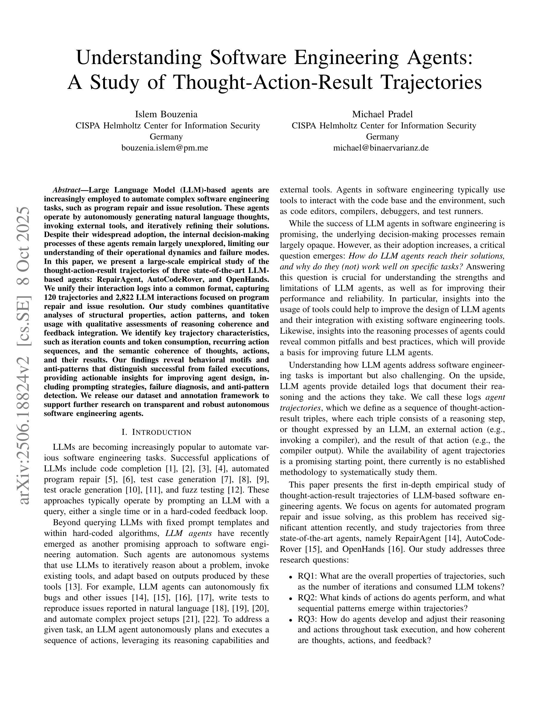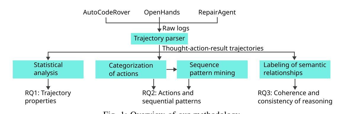 LLM基于的代理被广泛应用于自动化复杂的软件工程任务,如程序修复和问题解析。这些代理通过自主生成自然语言思维、调用外部工具并迭代优化解决方案来运行。本文进行了一项大规模实证研究,探讨了三种最新LLM代理(RepairAgent、AutoCodeRover和OpenHands)的思维行动结果轨迹。通过统一互动记录格式,聚焦于程序修复和问题解析的120条轨迹和2822次LLM互动进行分析。研究结合了结构性、行动模式与符号使用的定量分析,以及推理连贯性和反馈整合的定性评估。研究发现成功与失败执行的关键轨迹特征,提供改进代理设计的实用见解,包括提示策略、故障诊断和反模式检测。