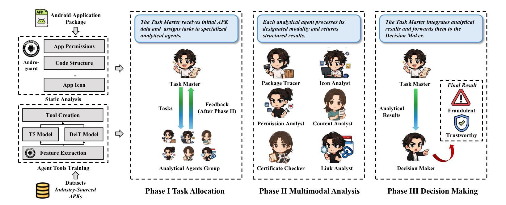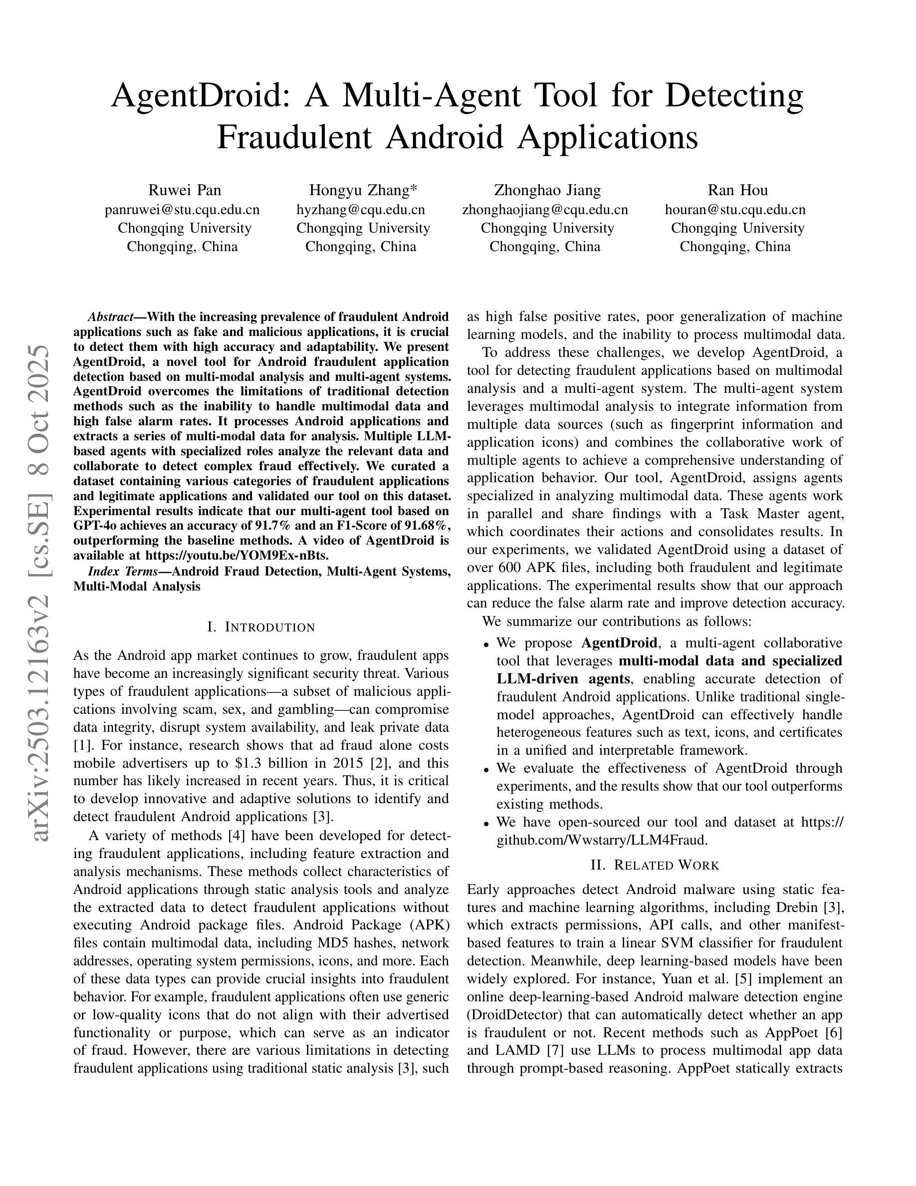 随着虚假和恶意等欺诈性Android应用程序的普及,以高准确度和适应性检测它们变得至关重要。我们推出了AgentDroid,这是一种基于多模态分析和多智能体系统的新型Android欺诈应用程序检测工具。AgentDroid克服了传统检测方法的局限性,如无法处理多模态数据和误报率高的问题。它处理Android应用程序并提取一系列多模态数据进行分析。多个具有专业角色的基于大型语言模型的智能体分析相关数据并进行协作,有效检测复杂的欺诈行为。我们整理了一个包含各类欺诈应用程序和合法应用程序的数据集,并在该数据集上验证了我们工具的性能。实验结果表明,我们基于GPT-4o的多智能体工具达到了91.7%的准确率和91.68%的F1分数,优于基准方法。有关AgentDroid的视频可在https://youtu.be/YOM9Ex-nBts观看。