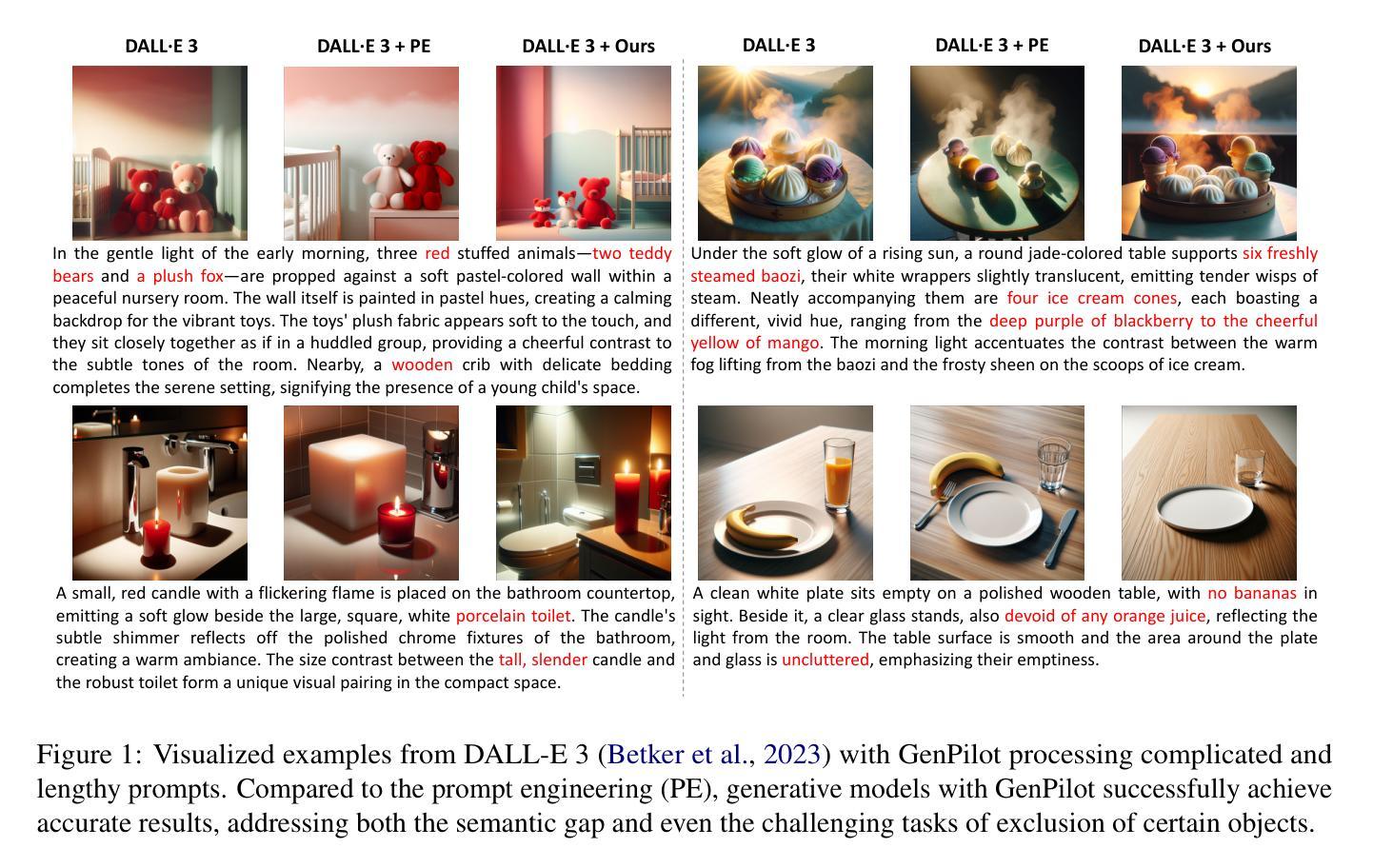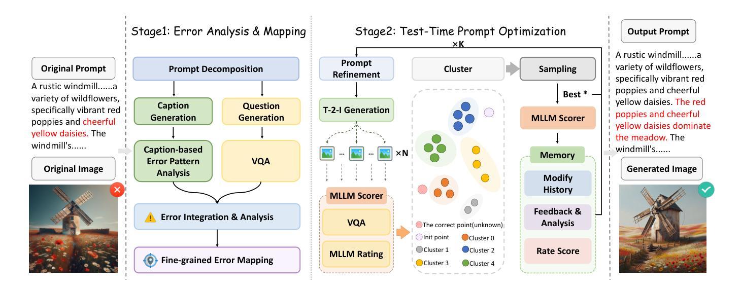 文本到图像合成已经取得了显著的进步,然而,准确解释复杂且冗长的提示仍然是一个挑战,这常常会导致语义不一致和细节缺失。现有的解决方案,如微调,是模型特定的并且需要进行训练,而先前的自动提示优化(APO)方法通常缺乏系统的误差分析和改进策略,导致可靠性和有效性有限。同时,测试时缩放方法固定在提示、噪声或样本数量上,限制了其解释性和适应性。为了解决这些问题,我们引入了一种灵活高效的测试时提示优化策略,该策略直接在输入文本上操作。我们提出了一个即插即用的多智能体系统,称为GenPilot,它集成了误差分析、基于聚类的自适应探索、精细验证和一个用于迭代优化的记忆模块。我们的方法是模型无关的、可解释的,并且非常适合处理长和复杂的提示。同时,我们总结了常见的错误模式和改进策略,提供更多的经验并鼓励进一步探索。在DPG-bench和Geneval上的实验,改进率高达16.9%和5.7%,证明了我们方法在增强文本和图像的一致性以及生成图像的结构连贯性方面的强大能力,显示了我们的测试时提示优化策略的有效性。代码可在https://github.com/27yw/GenPilot获取。