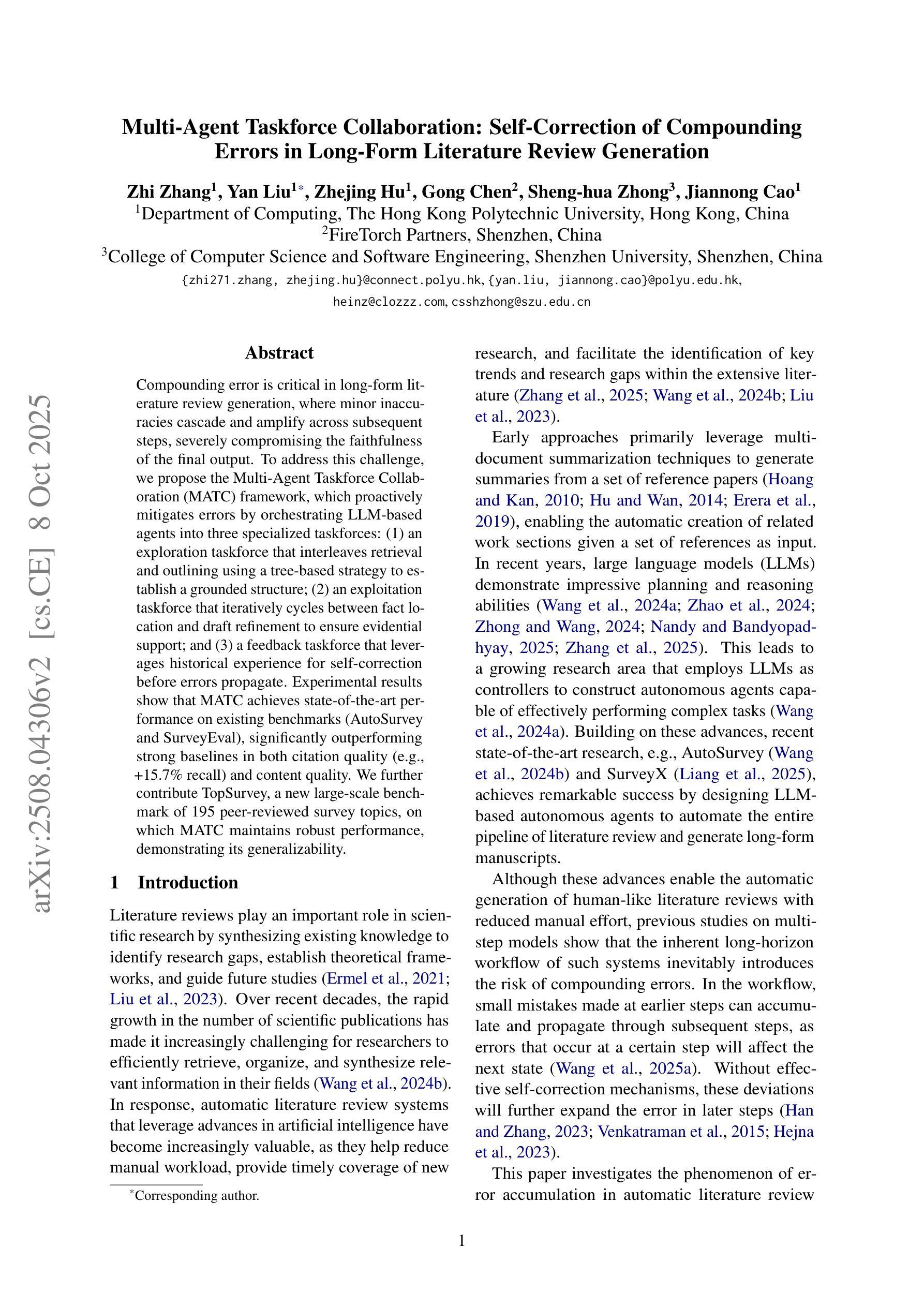 在长篇文献综述生成中,累积误差至关重要。轻微的不准确会在后续步骤中累积并放大,严重损害最终输出的忠实度。为了应对这一挑战,我们提出了多智能体协作(MATC)框架,它通过协调基于大型语言模型的智能体来主动减少错误,分为以下三个专业小组:(1)一个探索小组,采用基于树状结构的策略进行检索和概要介绍,以建立基础结构;(2)一个开发小组,在事实定位和初稿修订之间循环迭代,以确保证据支持;(3)一个反馈小组,利用历史经验进行自我校正,以防误差传播。实验结果表明,MATC在现有基准测试(AutoSurvey和SurveyEval)上取得了最新技术水平的高性能表现,并且在引文质量(如+ 15.7%召回率)和内容质量上均大大优于强大的基线模型。我们还推出了TopSurvey,这是一个包含195个同行评审调查主题的大规模新基准测试集,MATC在该数据集上同样表现出稳健的性能,证明了其通用性。