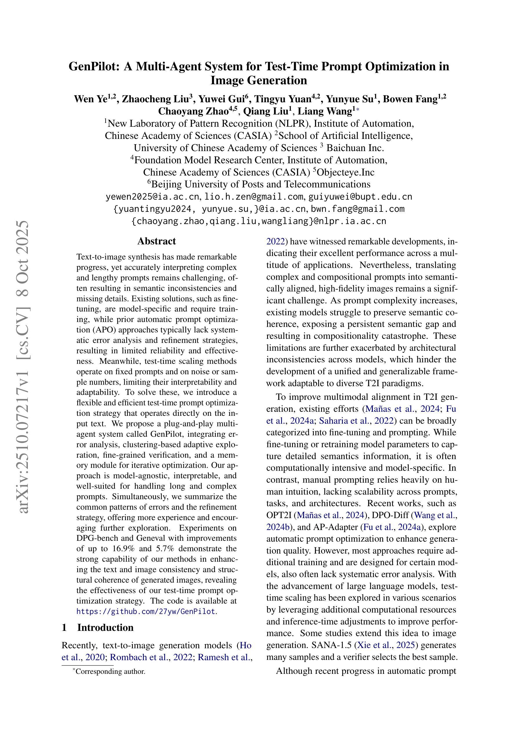 文本至图像合成技术取得显著进展,但仍面临复杂和冗长提示语的准确解读挑战,导致语义不一致和细节缺失。现有解决方案如微调存在模型特定性和训练需求,而自动提示优化方法缺乏系统错误分析和改进策略,可靠性有限。为解决这些问题,我们提出一种灵活高效的测试时间提示优化策略,直接在输入文本上操作。我们提出了一个即插即用的多智能体系统GenPilot,集成错误分析、基于聚类的自适应探索、精细验证和记忆模块进行迭代优化。该方法具有模型无关性、可解释性,适合处理长而复杂的提示语。在DPG-bench和Geneval上的实验表明,我们的方法提高了文本与图像的一致性和图像的结构连贯性,显示出测试时间提示优化策略的有效性。