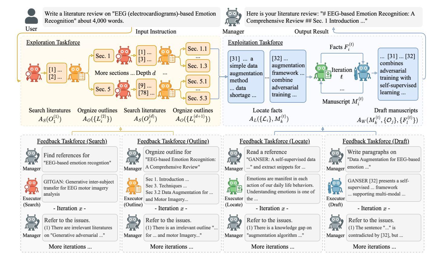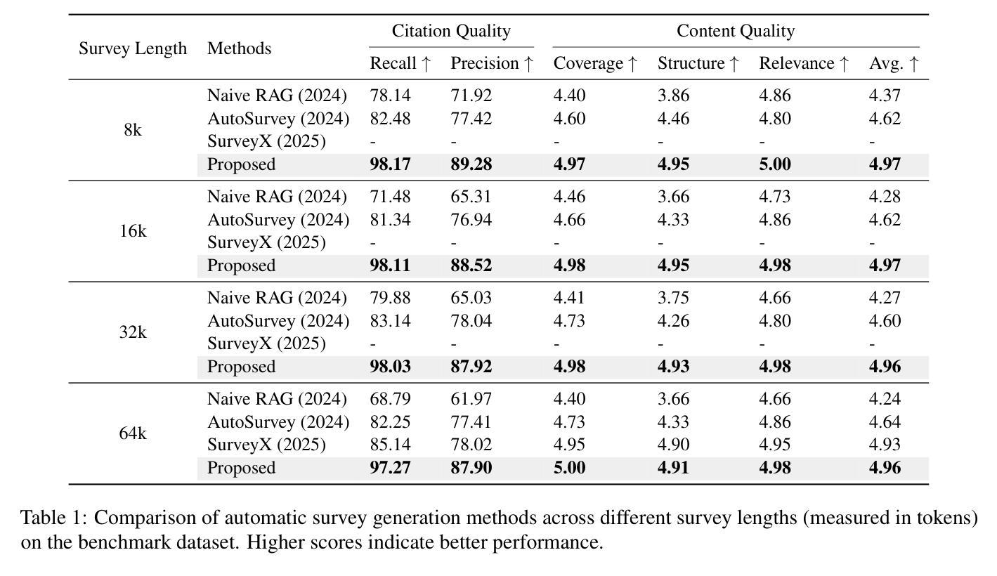 文本中强调了长文本文献综述生成中累积误差的重要性,并提出了多代理任务协作(MATC)框架来解决这一问题。该框架通过协调LLM代理来主动减少错误,分为三个专业小组:探索小组采用树形策略进行检索和提纲编制;开发小组负责事实定位和初稿修改以确保证据支持;反馈小组利用历史经验进行自我修正以避免错误传播。实验结果表明,MATC在现有基准测试上取得了最佳性能,显著提高了引用质量(如召回率提高15.7%)和内容质量。此外,还推出了新的大规模基准测试TopSurvey,MATC在此测试中同样表现稳健,证明了其通用性。