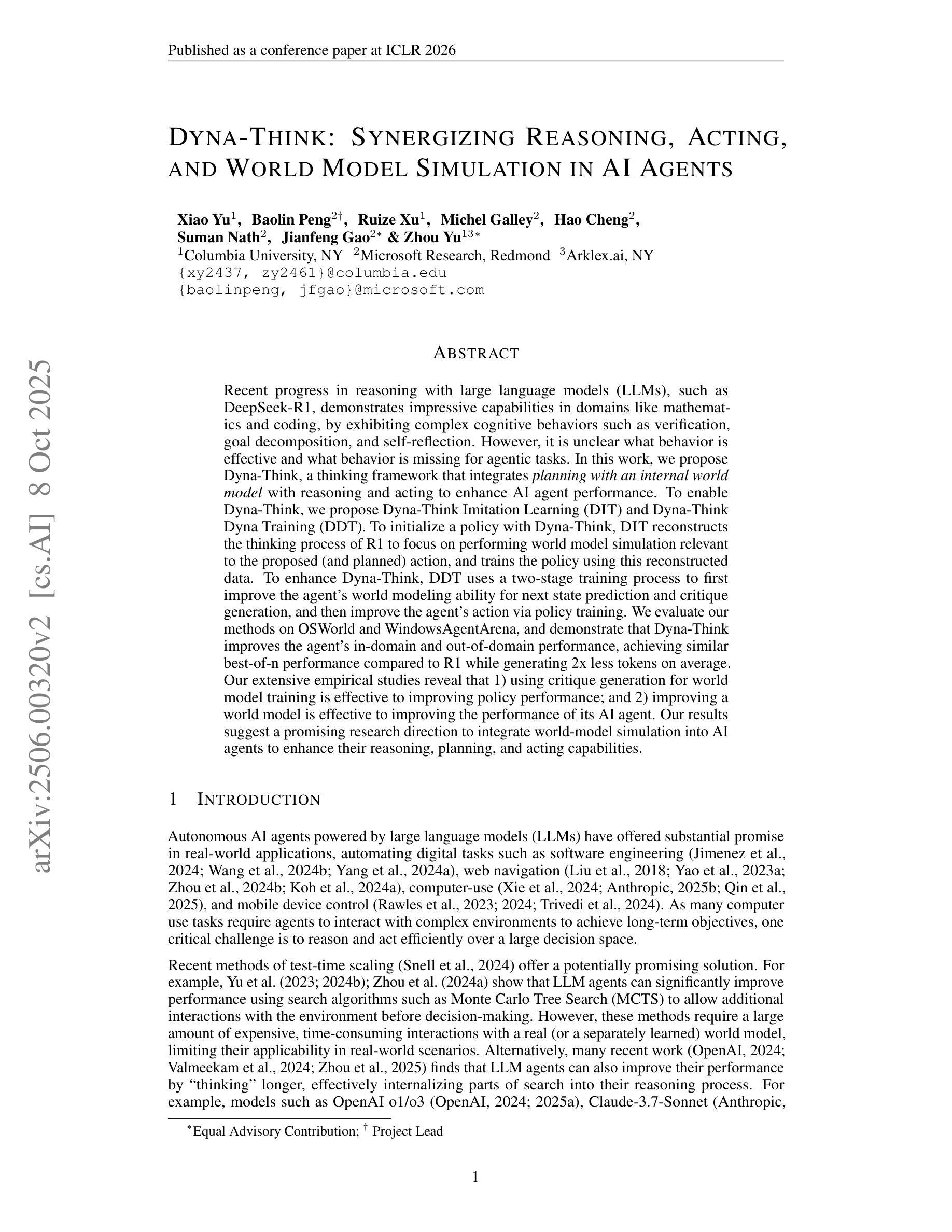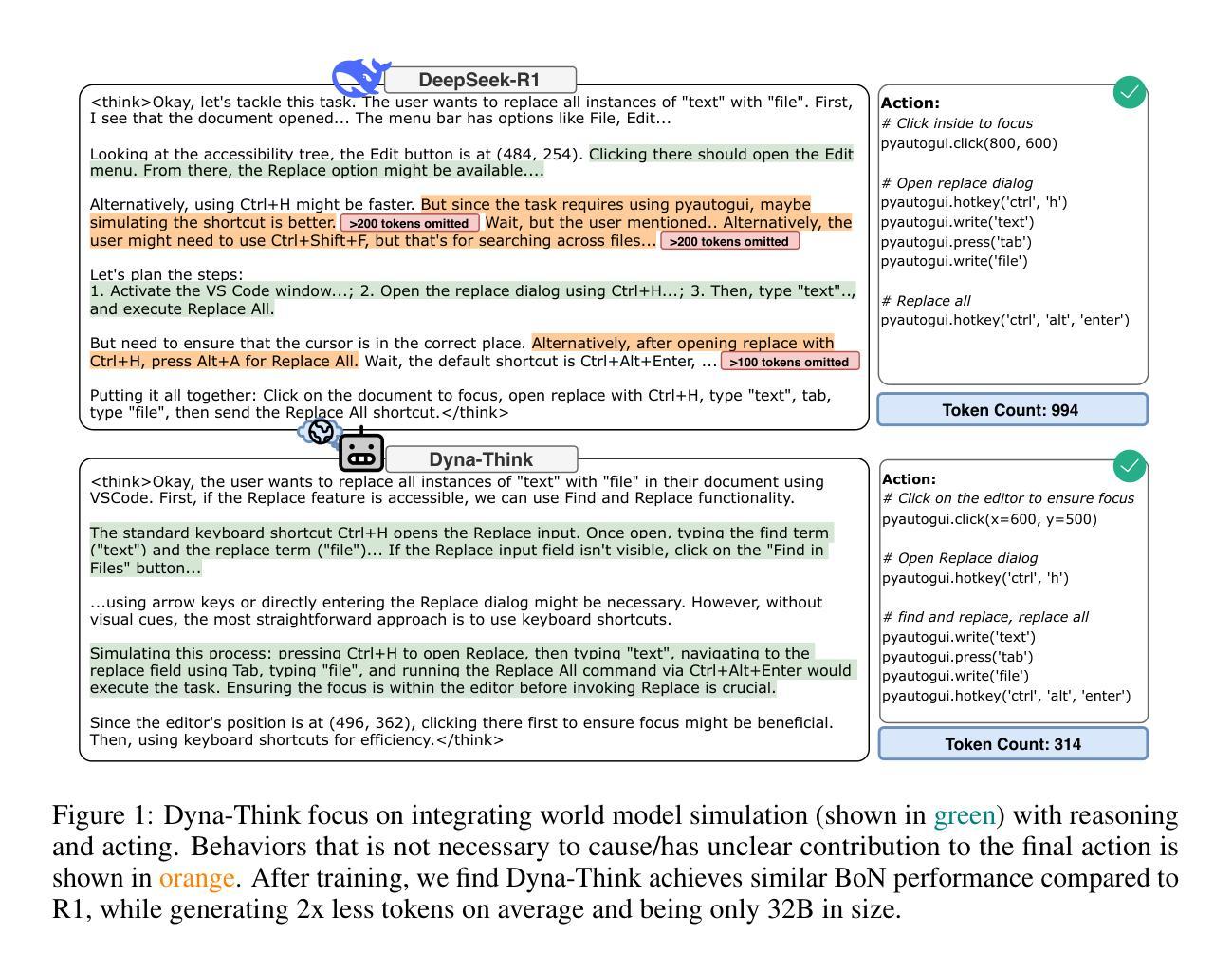 最近大型语言模型(LLMs)如DeepSeek-R1在推理方面的进展展示出了令人印象深刻的数学和编程领域能力,展现了如验证、目标分解和自我反思等复杂的认知行为。然而,对于长期的人工智能代理任务,尚不清楚哪些行为是有效的,哪些行为是缺失的。在这项工作中,我们提出了Dyna-Think,这是一个结合了规划、内部世界模型、推理和行动的思考框架,旨在提高人工智能代理的性能。为了实现Dyna-Think,我们提出了Dyna-Think模仿学习(DIT)和Dyna-Think动态训练(DDT)。为了用Dyna-Think初始化策略,DIT重构了R1的思考过程,专注于执行与所提议(和计划)的行动相关的世界模型模拟。然后使用这种重构的数据来训练策略。为了增强Dyna-Think,DDT采用两阶段训练过程,首先通过状态预测或评论生成等目标来提高代理的世界建模能力,然后通过策略训练来提高代理的行动能力。我们在OSWorld和WindowsAgentArena上评估了我们的方法,并证明Dyna-Think提高了代理的域内和域外性能,与R1相比实现了类似的最佳n次性能,但平均生成的令牌数量减少了2倍。我们广泛的实证研究证实:1)使用评论生成进行世界模型训练对于提高策略性能是有效的;2)表现更好的人工智能代理与更好的世界建模能力相关。我们相信我们的研究结果为实现将世界模型模拟融入人工智能代理以提高其推理、规划和行动能力这一研究方向提供了希望。