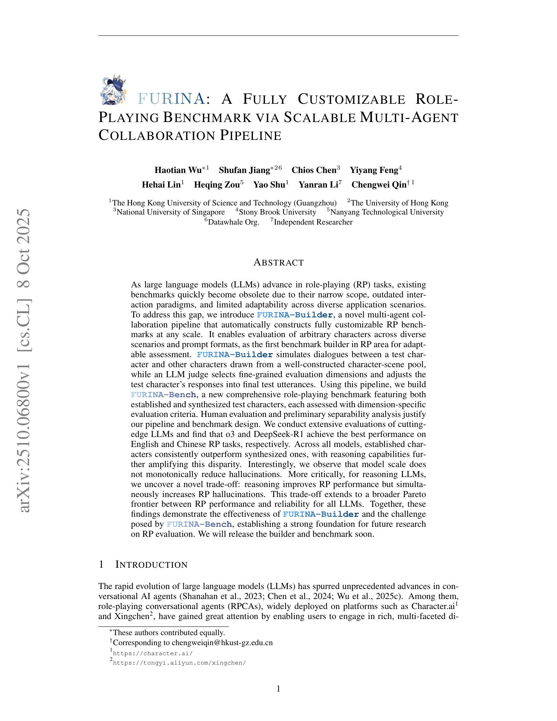 随着大型语言模型(LLM)在角色扮演(RP)任务中的进步,现有基准测试由于其范围狭窄、交互模式过时以及在不同应用场景中的适应性有限,很快变得过时。为了解决这一差距,我们引入了FURINA-Builder,这是一种新型多智能体协作管道,能够自动构建任何规模的完全可定制的角色扮演基准测试。它能够在多样化的场景和提示格式中评估任意角色,作为角色扮演领域第一个可适应的评估基准测试构建器。FURINA-Builder模拟测试角色与其他角色之间的对话,这些其他角色来自构建良好的角色场景池,同时由LLM裁判选择精细的评价维度,并调整测试角色的响应以形成最终的测试话语。使用此管道,我们构建了FURINA-Bench,这是一个新的全面的角色扮演基准测试,其中包括既定的和合成的测试角色,每个角色都根据特定的评价维度进行评估。人类评估和初步的可分离性分析证明了我们管道和基准测试设计的合理性。我们对最前沿的LLM进行了广泛评估,发现o3和DeepSeek-R1在英语和中文角色扮演任务上表现最佳。在所有模型中,既定角色的表现始终优于合成角色,推理能力进一步加大了这种差距。有趣的是,我们观察到模型规模并不单调减少幻觉。更重要的是,对于具有推理能力的LLM,我们发现了一个新的权衡:推理能力提高了角色扮演的性能,但同时增加了角色扮演的幻觉。这种权衡扩展到了所有LLM的RP性能和可靠性之间的帕累托前沿。这些发现证明了FURINA-Builder的有效性以及FURINA-Bench所构成的挑战。