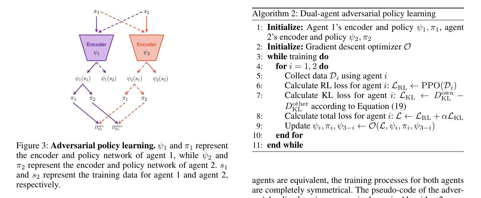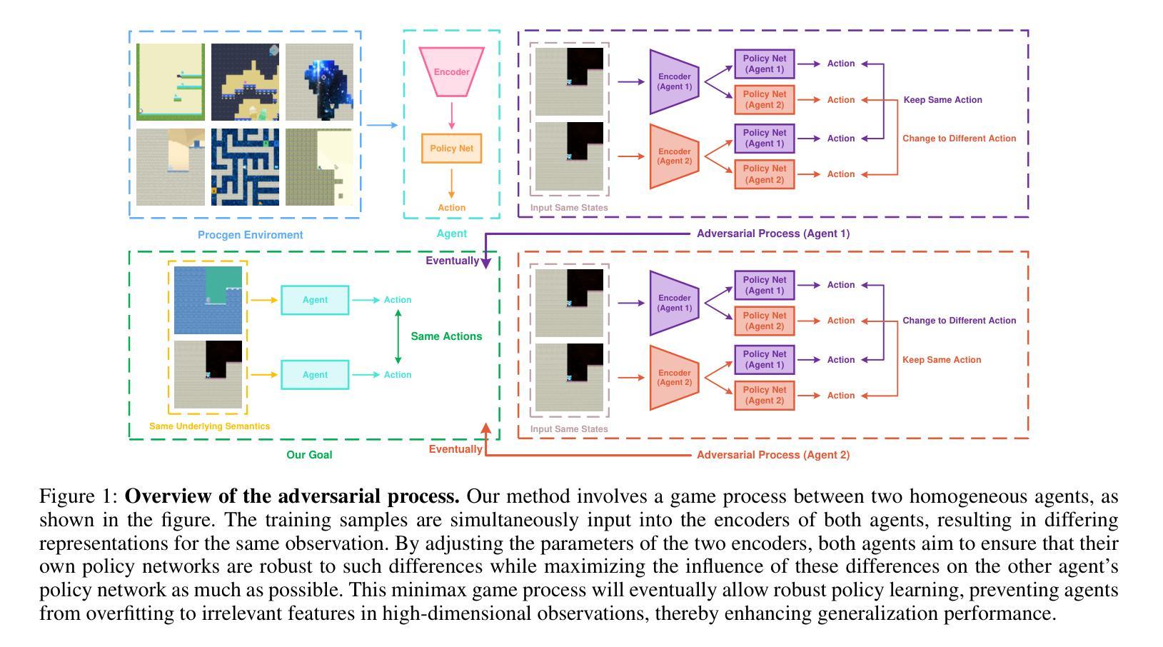 - 这种对抗互动鼓励代理学习可泛化的策略,处理高维观察中的无关特征。