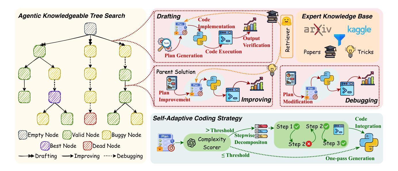 - AutoMind框架通过三个关键进展克服这些缺点:专家知识库、知识树搜索算法和自适应编码策略。