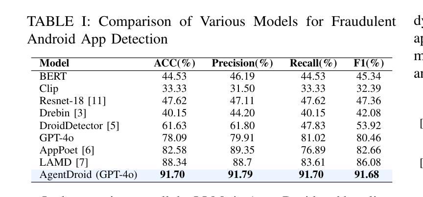 - 实验结果显示,AgentDroid在检测欺诈应用方面表现出高准确率和良好的性能。