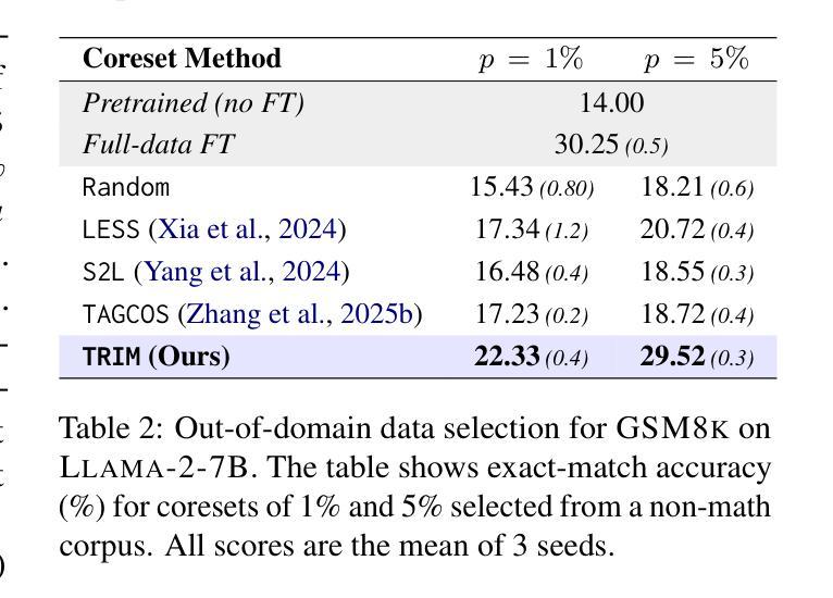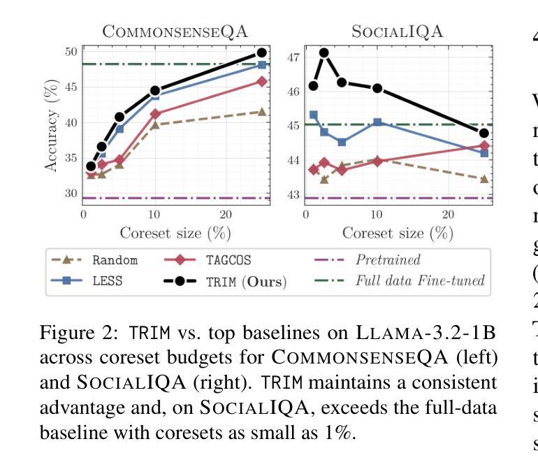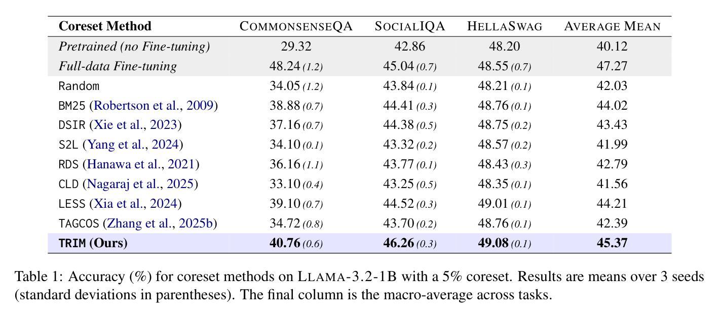 - TRIM框架通过匹配基于注意力“指纹”的潜在模式进行核心集选择,无需依赖梯度信息。