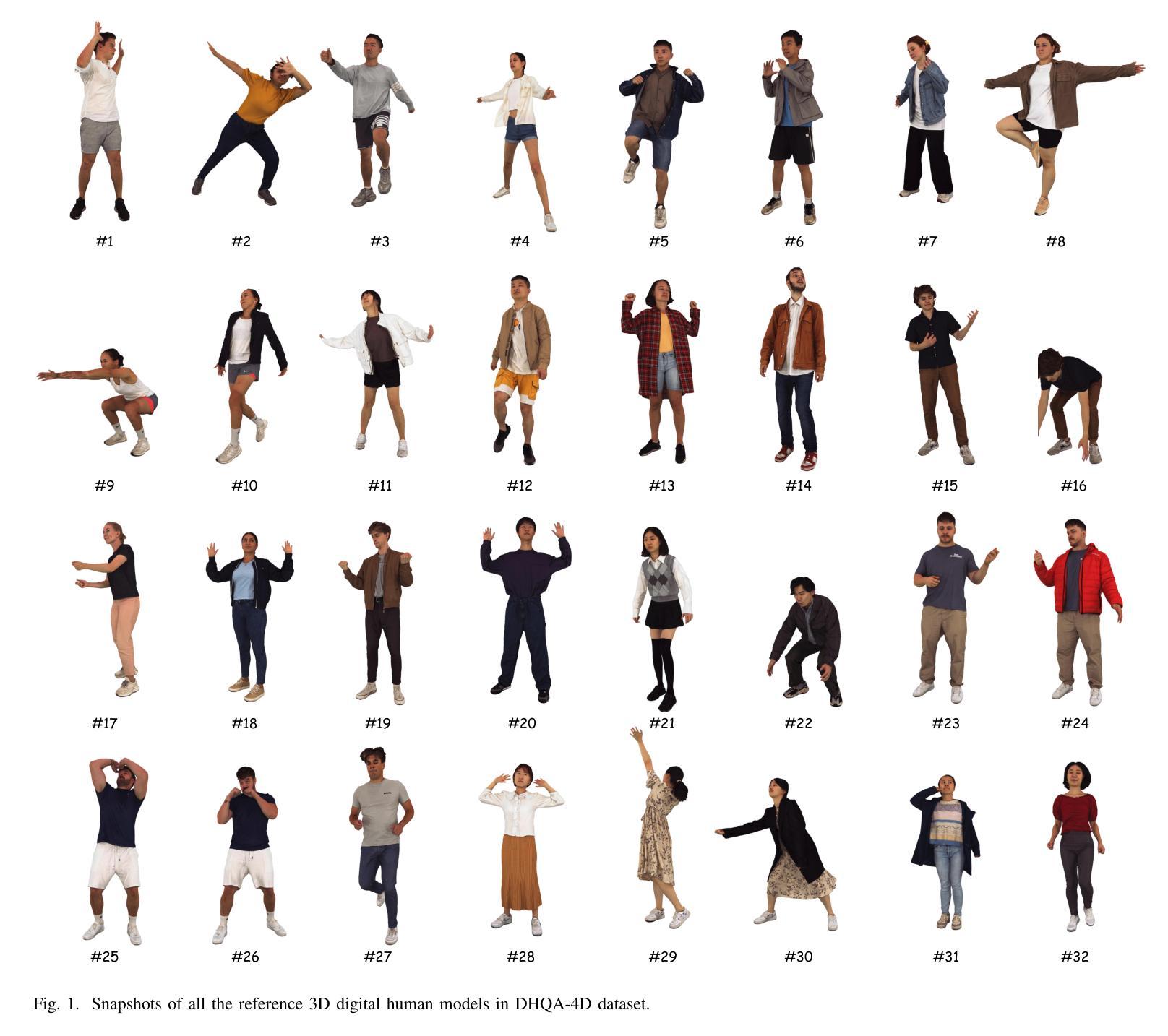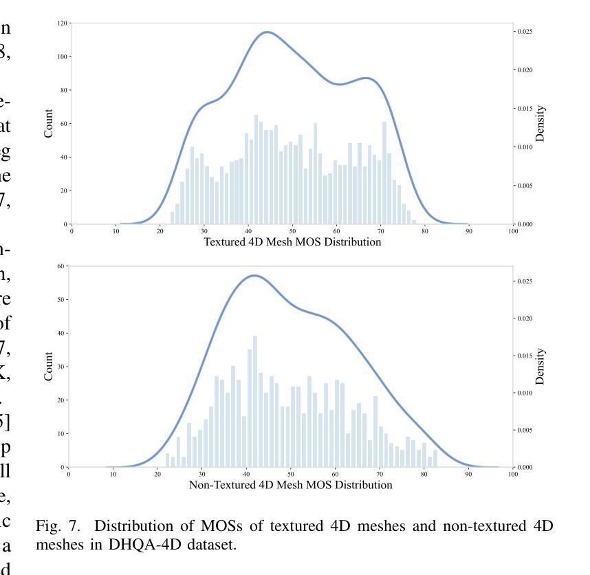 随着3D扫描和重建技术的快速发展,基于4D网格的动态数字人类化身越来越受欢迎。可应用于游戏制作、动画制作和远程沉浸式通信等领域。然而,这些4D人类化身网格在收集、压缩和传输过程中容易受到各种噪声的影响,从而影响用户体验。因此,对动态4D数字人的质量评估变得尤为重要。本文首先提出大规模动态数字人类质量评估数据集DHQA-4D,包含32个高质量真实扫描的4D人类网格序列、1920个由11种纹理失真产生的失真纹理4D人类网格及其相应的纹理和非纹理平均意见得分(MOSs)。配备DHQA-4D数据集,我们分析了不同类型失真对纹理动态4D网格和非纹理动态4D网格的人类感知的影响。此外,我们提出了基于动态网格评分器(DynaMesh-Rater)的新型大型多模态模型(LMM)方法,能够评估纹理和非纹理的4D网格。该方法通过提取多维特征,包括来自投影的二维视频的视觉特征、来自裁剪的视频剪辑的运动特征以及来自4D人类网格的几何特征,提供全面的质量相关信息。然后利用LMM模型整合多维特征,并采用LoRA技术进行指令微调,教导模型预测质量分数。在DHQA-4D数据集上的广泛实验结果表明,我们的DynaMesh-Rater方法优于先前的质量评估方法。